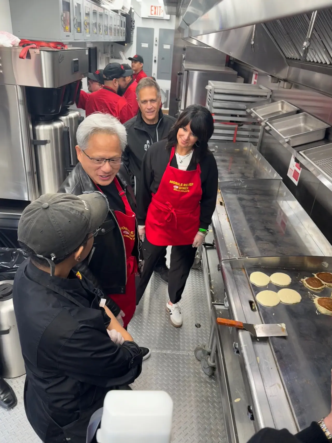 除了享受早餐,黃仁勳也獻上驚喜。根據中央社報導,美國科技類Podcast龍頭Acquired現場進行Live直播訪問,受邀貴賓包括聯發科執行長蔡力行,還有鴻海董事長劉揚偉、英特爾前執行長季辛格等重量級人士。黃仁勳身穿紅色圍裙、客串服務生現身,除了為主持人和蔡力行送上鬆餅,還打趣提到Denny’s真的是世界上最好的公司,因為他們每天提供兩餐免費餐,但「不包括紐約牛排」。