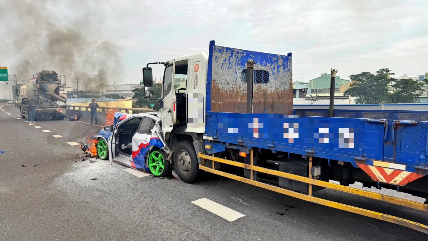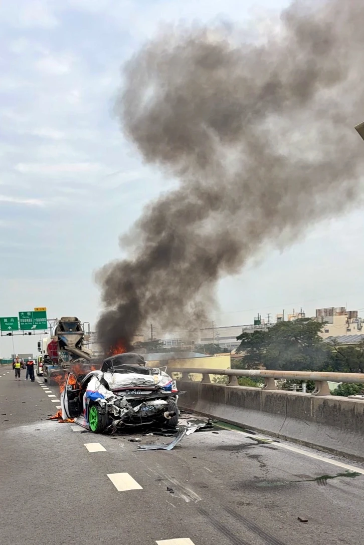 2大車前後夾擊,轎車當場變形並起火燃燒,帥氣塗裝瞬間付之一炬,令人惋惜。所幸,首當其衝的38歲陳姓駕駛及時自行脫困,雖有部分擦挫傷,但意識清醒,送醫後無生命危險。