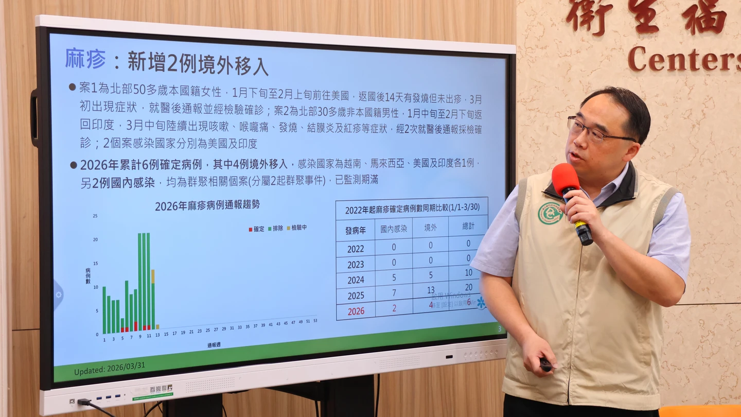 【記者林芳如/台北報導】國內新增2例境外移入麻疹,疾管署說明,案1為北部50多歲本國籍女性,今年1月下旬至2月上旬前往美國紐約,返國後14天有發燒但未出疹,3月初出現意識不清疑似腦炎症狀,至醫院急診後通報檢驗確診,匡列接觸者339名;案2為北部30多歲印度籍男性,今年1月中旬至2月下旬返回印度,返台後16天陸續出現咳嗽、喉嚨痛、發燒、結膜炎及紅疹等症狀,經2次就醫後通報採檢確診,匡列接觸者719名。