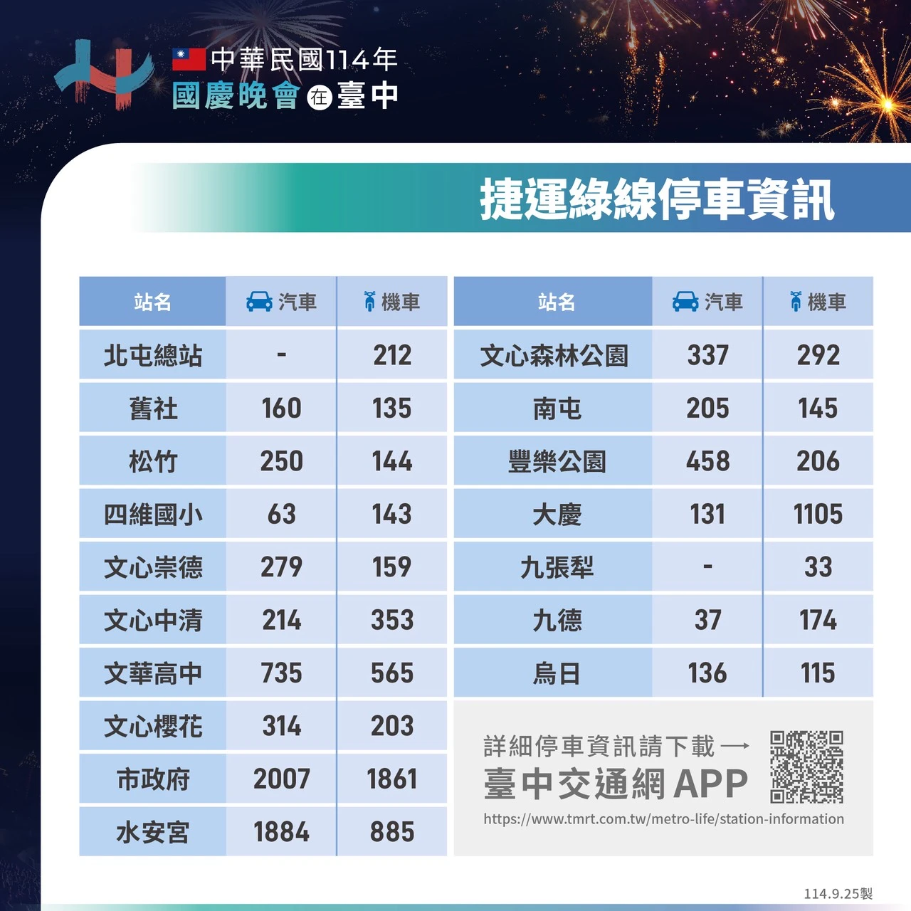 台中市觀旅局長陳美秀表示,今年國慶晚會總場地面積達8.8公頃,鄰近捷運文心森林公園站,交通便捷,主會場與第二轉播區可容納約1萬4千人,活動從下午4點30分開放入場,晚間6點30分正式開演,民眾無需索票即可自由入場觀賞。