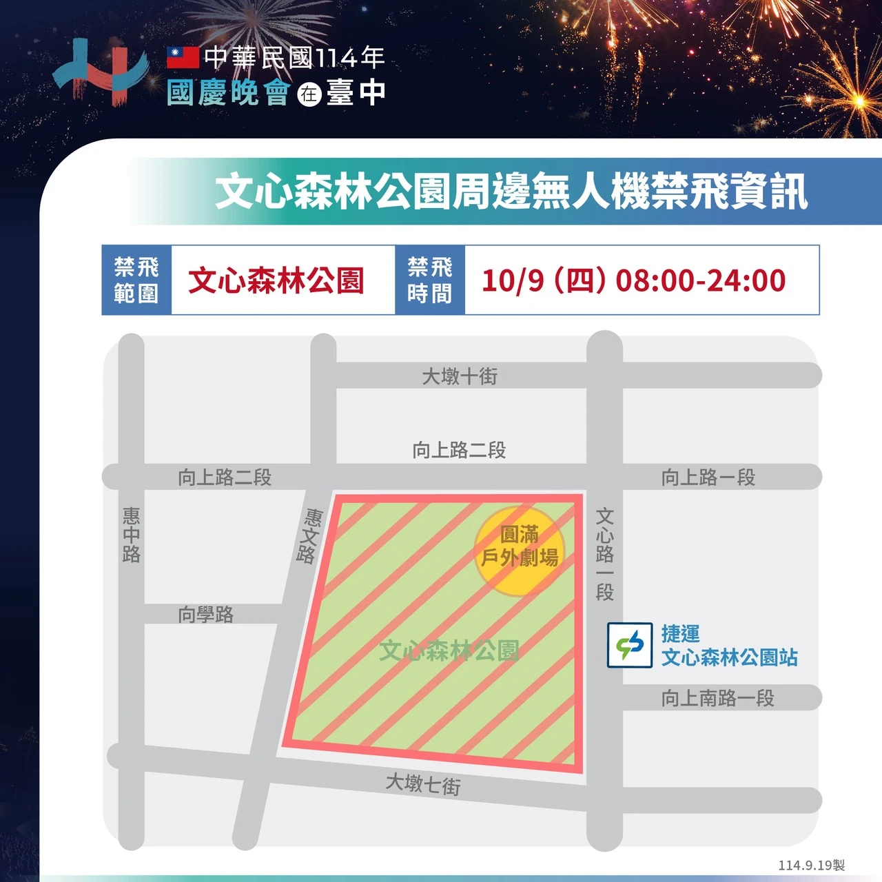 觀旅局提醒,活動當天上午8點起至10月10日0時止,文心森林公園全域禁飛無人機,入場前須配合安檢,禁止攜帶大型背包、自拍棒、腳架及長柄雨傘;除導盲犬外,禁止攜帶寵物入內,飲料及液體須試飲後方可帶入,場內禁止飲酒。