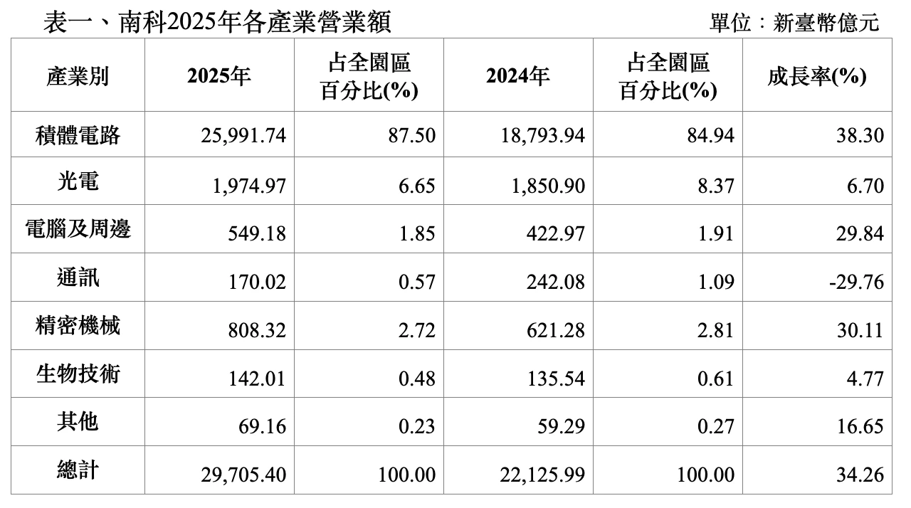 【記者王志弘/台南報導】南科園區2025年交出驚人成績單!受AI浪潮興起,整體營業額直衝2.97兆元,年增率高達34.26%,其中積體電路就貢獻近2.6兆,顯見未來趨勢,也令南科穩坐全球科技供應鏈核心,就業人數已破9.8萬人大關,為大南方矽島注入強勁發展動能。