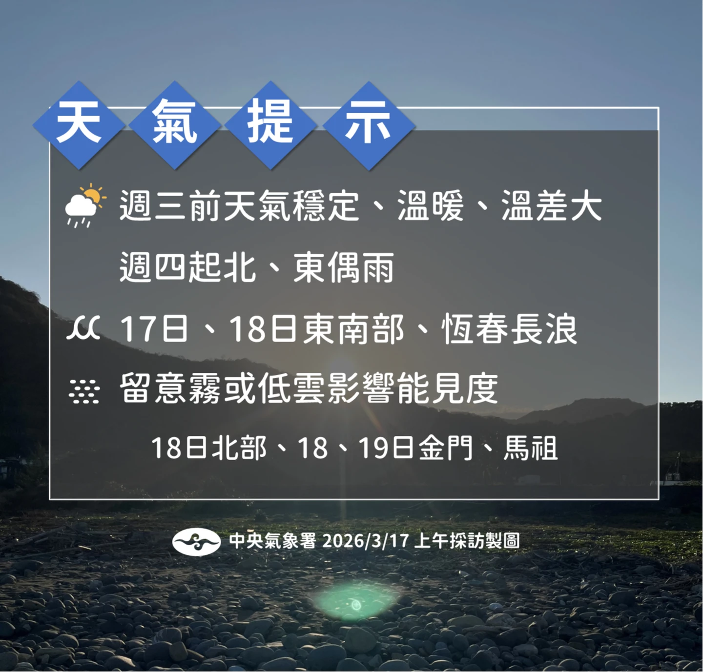 環境部提醒,西半部因擴散條件稍差,污染物易累積,北部空品區目前為「橘色提醒」等級,中南部局部地區短時間也可能達橘標。氣象署說,今清晨北部地區、金門及馬祖易有局部霧或低雲,行車與往返離島的民眾請務必留意能見度。
