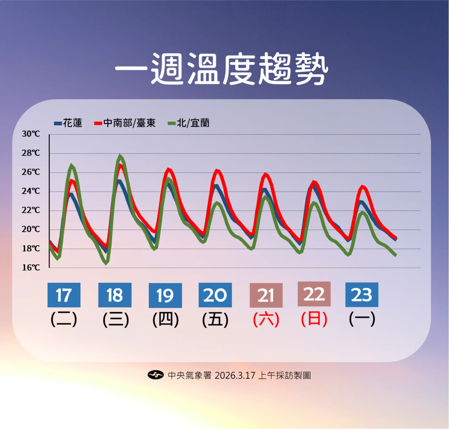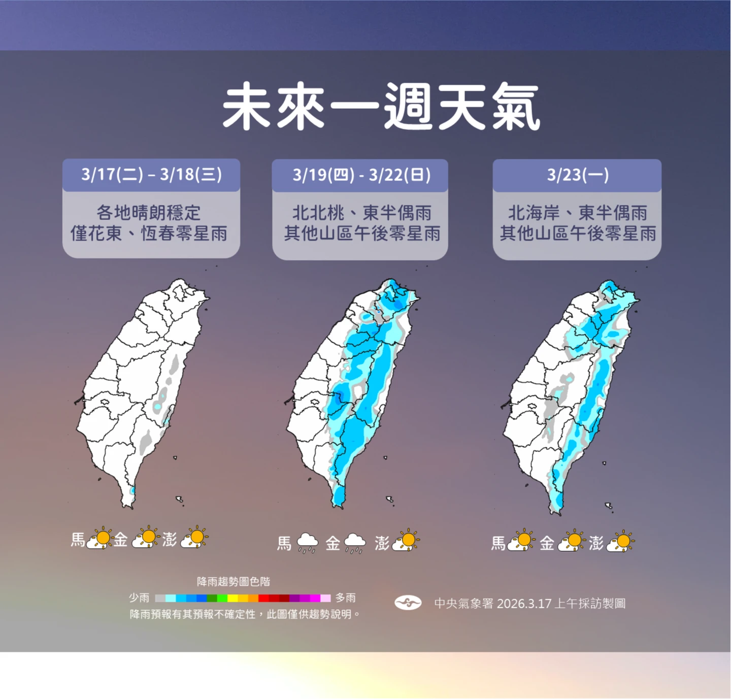 周五、六(20、21日)微弱鋒面掠過、北部、東半部轉有局部短暫雨;北台轉涼,中南部白天微熱、早晚涼。下周日至周四(22至26日)微弱鋒面北移、消散,各地恢復晴朗穩定,白天微熱(約30°C、逐日緩升至30°C以上)、早晚偏涼,東半部偶有零星少量飄雨的機率。