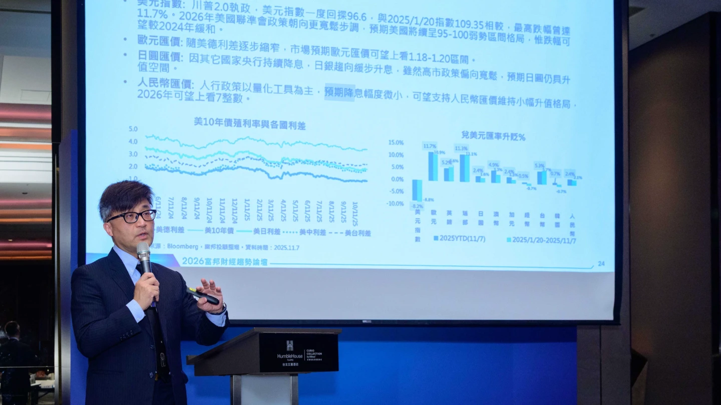 陳奕光指出,貨幣政策也是重要觀測指標,聯準會政策利率朝向3%中性利率,12月結束縮表,聯準會下任主席政策節奏可望符合川普期待。隨著美國公債殖利率區間下移,資金持續流入,其他央行緩步降息,陸續達到降息目標,日銀將採溫和升息基調,台灣2025年出口與GDP成長強勁,央行維持2%重貼現率不變,預期短期內降息機率不高。