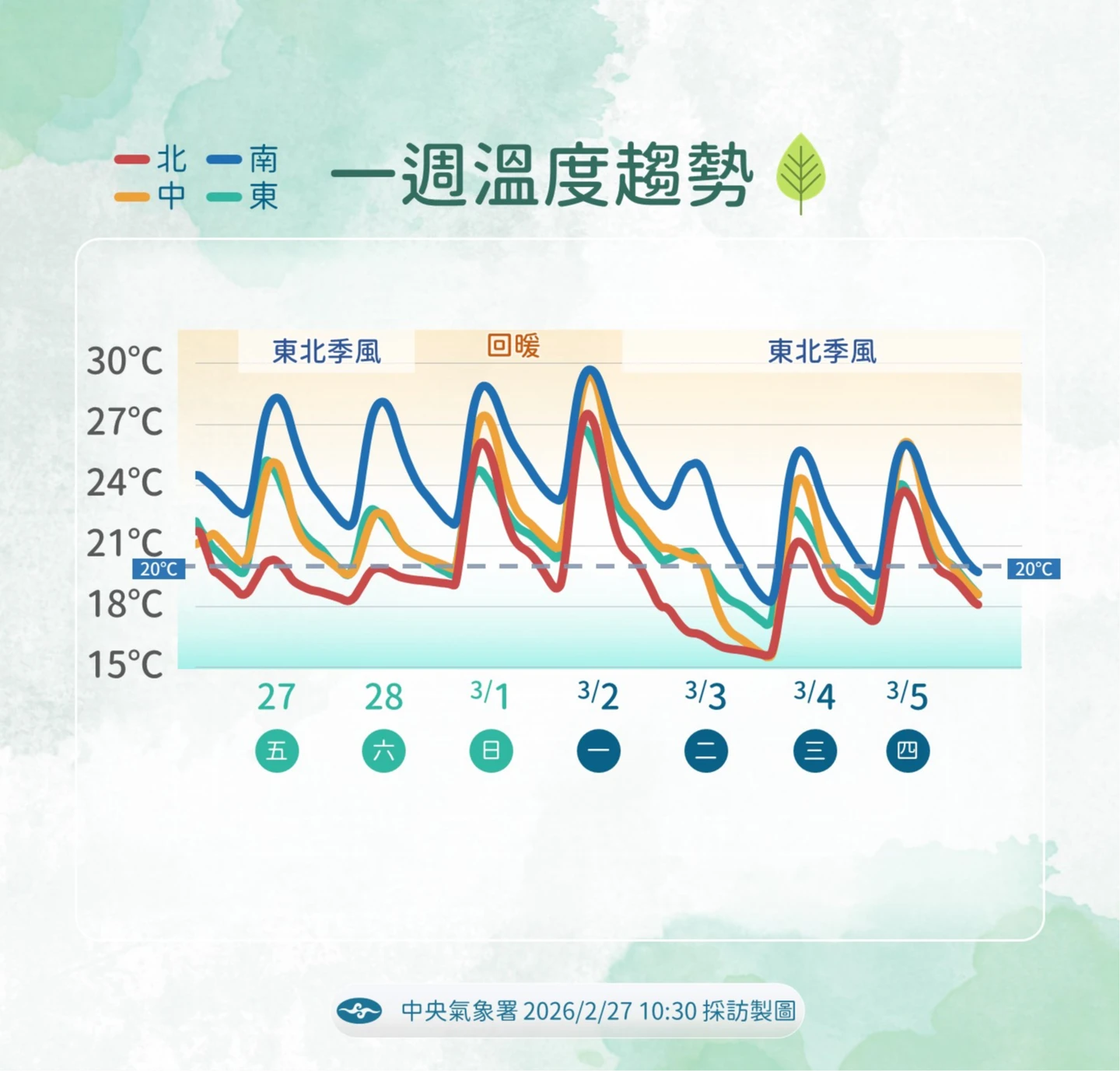 到了3/1周日,降雨區域將逐漸北移,上半天中部以北仍有局部降雨,但下午起至3月2日周一工作日上半天,降雨會暫時停歇,迎來天氣回暖的短暫空檔。不過好天氣並未持續太久,3月2日下午起將有另一波鋒面南下,屆時北部與東部將再度轉為有局部短暫雨的天氣,氣溫也會隨之下降。