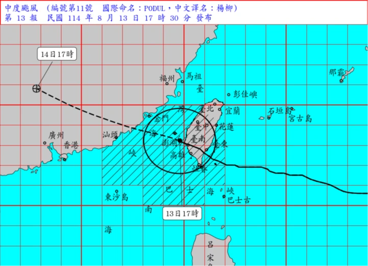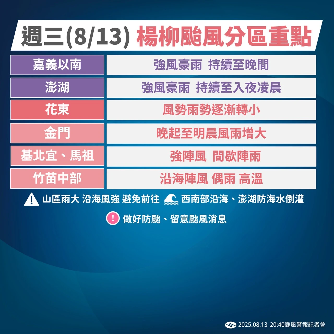 【記者劉沛妘、王良博/台北報導】楊柳颱風已於今(13)日下午1點登陸台東,並於16時左右從台南市七股區附近出海,氣象署預估,最快明(14)日清晨有機會解除颱風警報。另外,預估今晚到明晨,東部、南部降雨緩和,但澎湖、金門有較明顯的風雨,仍要留意。