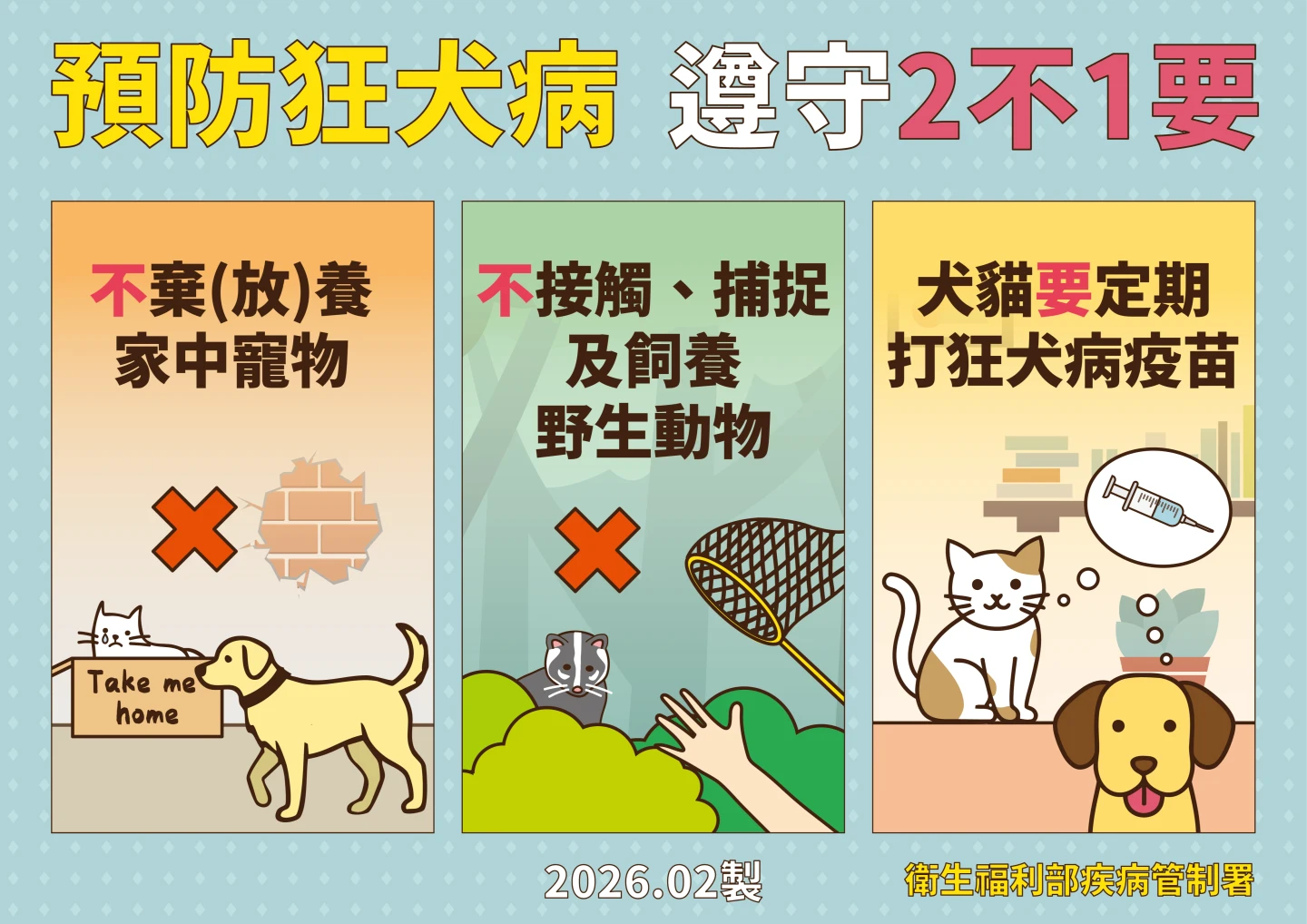 請民眾留意並遵守「二不一要」原則:不棄(放)養家中寵物、不接觸、捕捉及飼養野生動物、要定期攜帶犬貓及人工飼養之食肉目動物施打狂犬病疫苗,即可遠離狂犬病的威脅,但若寵物不幸感染狂犬病只能安樂死。