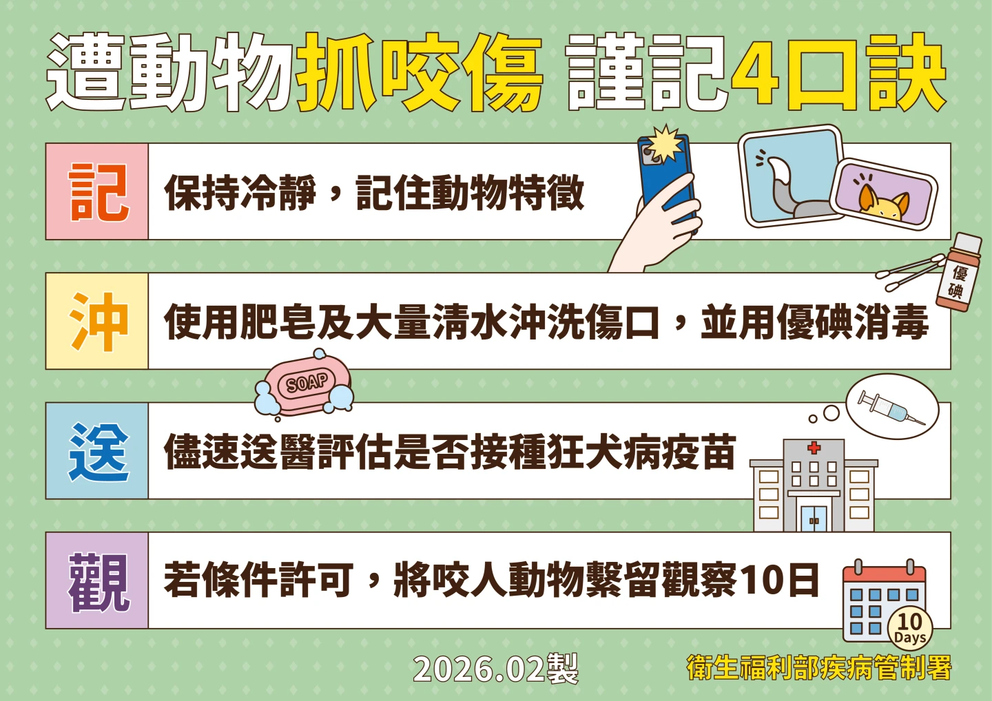 春節連假將近,疾管署及防檢署呼籲,民眾於郊外活動時,應避免接觸、逗弄及捕捉野生動物,以避免暴露於狂犬病的感染風險。人類如不慎遭野生動物抓咬傷,請以肥皂及大量流動清水沖洗傷口至少15分鐘,再以優碘或70%酒精消毒後,儘速前往「人用狂犬病疫苗接種服務醫院(衛生所)」就醫。