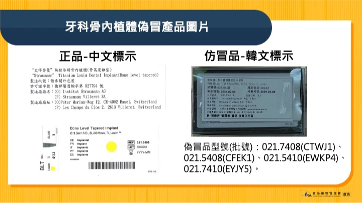食品藥物管理署副署長王德原表示,這個產品是植牙用的骨內植體。近日接獲台灣士卓曼醫療器械有限公司通報,有未經該公司授權的通路在國內銷售「“史得勞曼”純鈦洛新骨內植體(骨高度錐形)(衛部醫器輸字027794號)」許可證之的偽冒品,違規批號包含CTWJ1、CFEK1、EWKP4、EYJY5等4件。