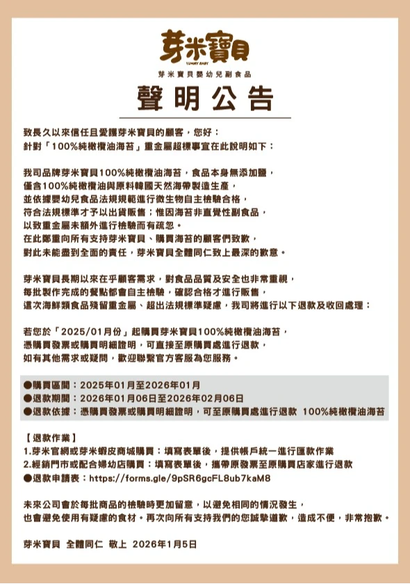 【記者盧麗蓮/綜合報導】行政院消費者保護處去年12月公布,50件市售嬰幼兒食品中,有4件不合規定,其中台灣產的汪汪隊立大功齒妍堂海苔酥,重金屬鉛和鎘均超標,引發國人關注,如間傳出又有其他嬰幼海苔爆食安。被點名重金屬超標的芽米寶貝,今早發出退款公告,表示「海苔非直覺性副食品,以致重金屬未額外進行檢驗而有疏忽」,向顧客致歉。