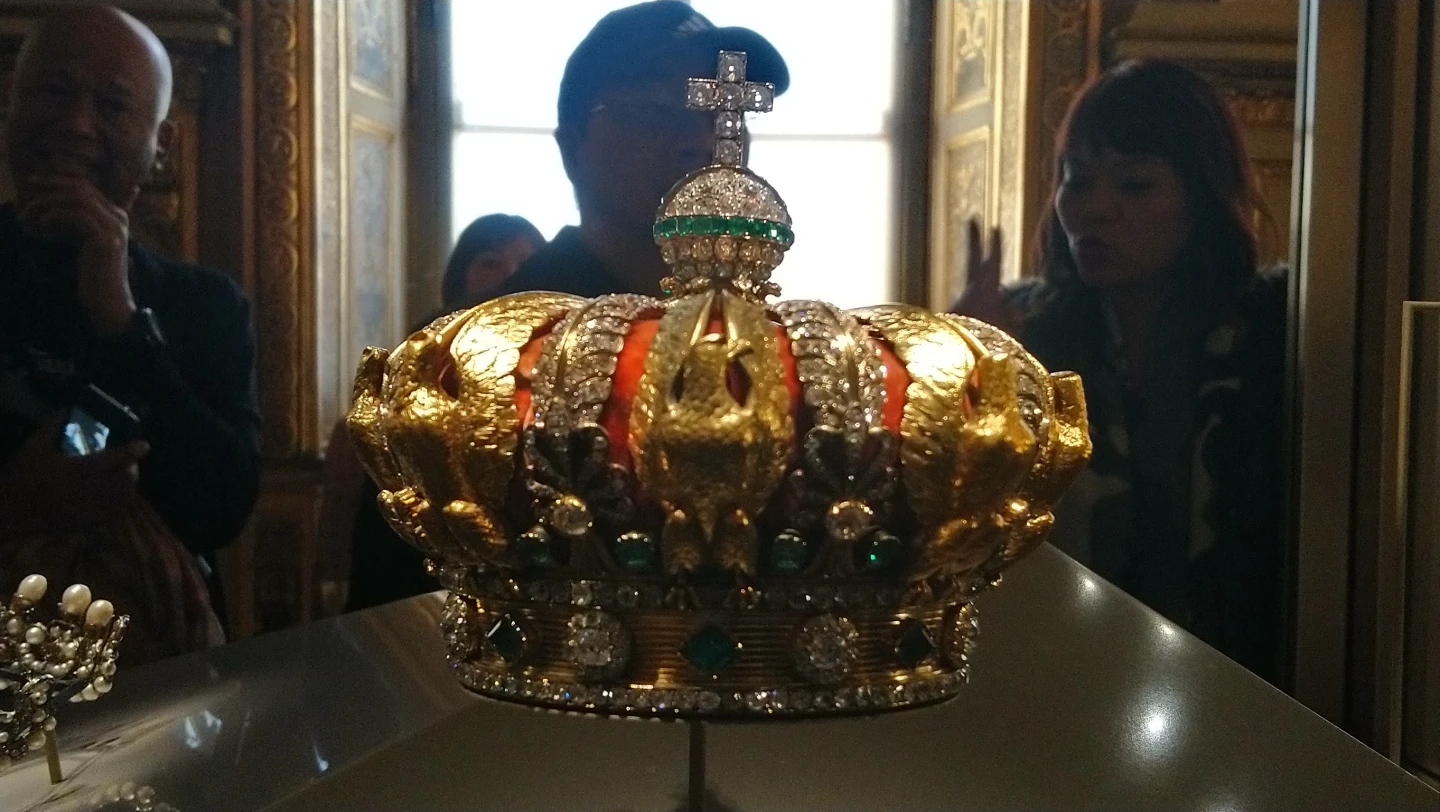 其中一件被盜的珍寶是歐仁妮皇后的皇冠,但似乎是竊賊隨後丟棄,在博物館附近被人發現,已受到損壞。這頂皇冠由8隻鑿刻金鷹的翅膀形成的帶狀結構,與8片由大棕櫚葉延伸出的棕櫚葉飾交替組成。皇冠上鑲嵌著102顆明亮式切割鑽石,這些鑽石取自歷史上曾屬於法國王室、鑲嵌於王冠上的珍貴鑽石,此外還加入了1252顆由帝國預算支付的明亮式切割鑽石和56顆祖母綠。