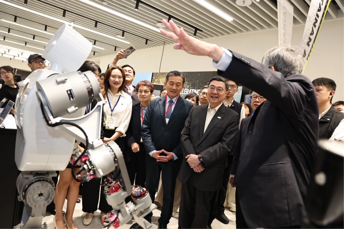 卓榮泰現場參觀包括機器人、晶片設計及智慧健康照護等8家廠商的研發成果。他特別提到,除了對外的交通建設,科學城內部的能源韌性也要做到最好,串聯軟硬體與雲端資源,形成最具競爭力的產業生態系。