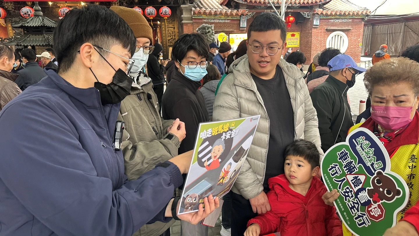 東區香火鼎盛的旱溪媽祖樂成宮舉辦「歲末揮毫贈春聯」活動,書法名家現場揮毫,吸引眾多信眾與居民排隊索取春聯,轄區第三分局東區分駐所把握人潮聚集時機,走入人群發送宣導資料,面對面說明春節期間治安維護與交通疏導重點。