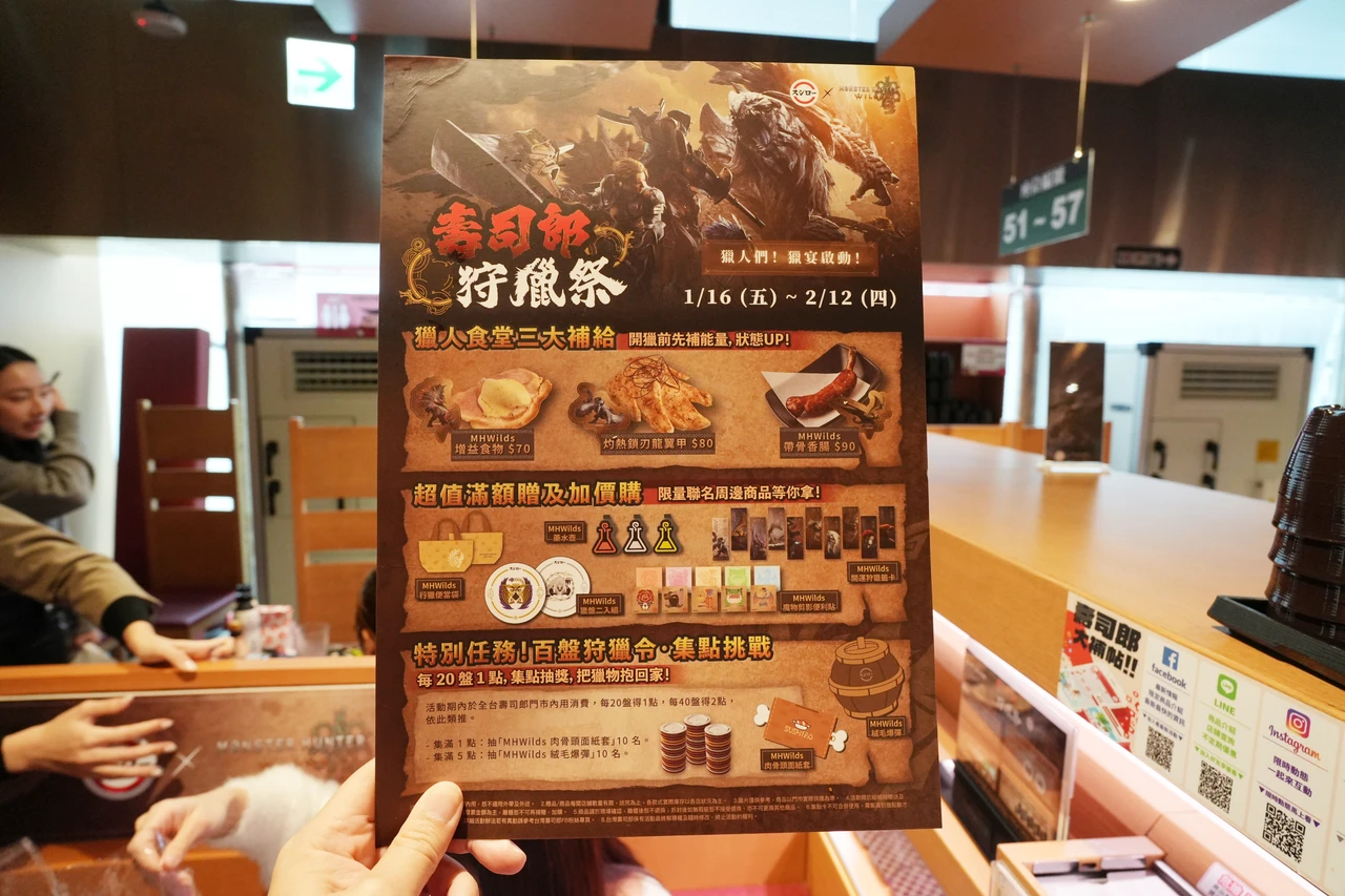 台灣壽司郎XMonster Hunter Wilds(魔物獵人 荒野)狩獵祭1月16日起登場,這次聯名菜單以「封面魔物」與「獵人補給」為靈感設計,首推「灼熱鎖刃龍翼甲80元」、「MHWilds帶骨香腸70元」、「MHWilds增益食物90元」每份皆隨機附贈印有魔物圖案的限量插卡;2月6日再推出盲袋藥水飲料組,「熱飲」、「冷飲」、「元氣飲料」3款能量飲料瓶設計。