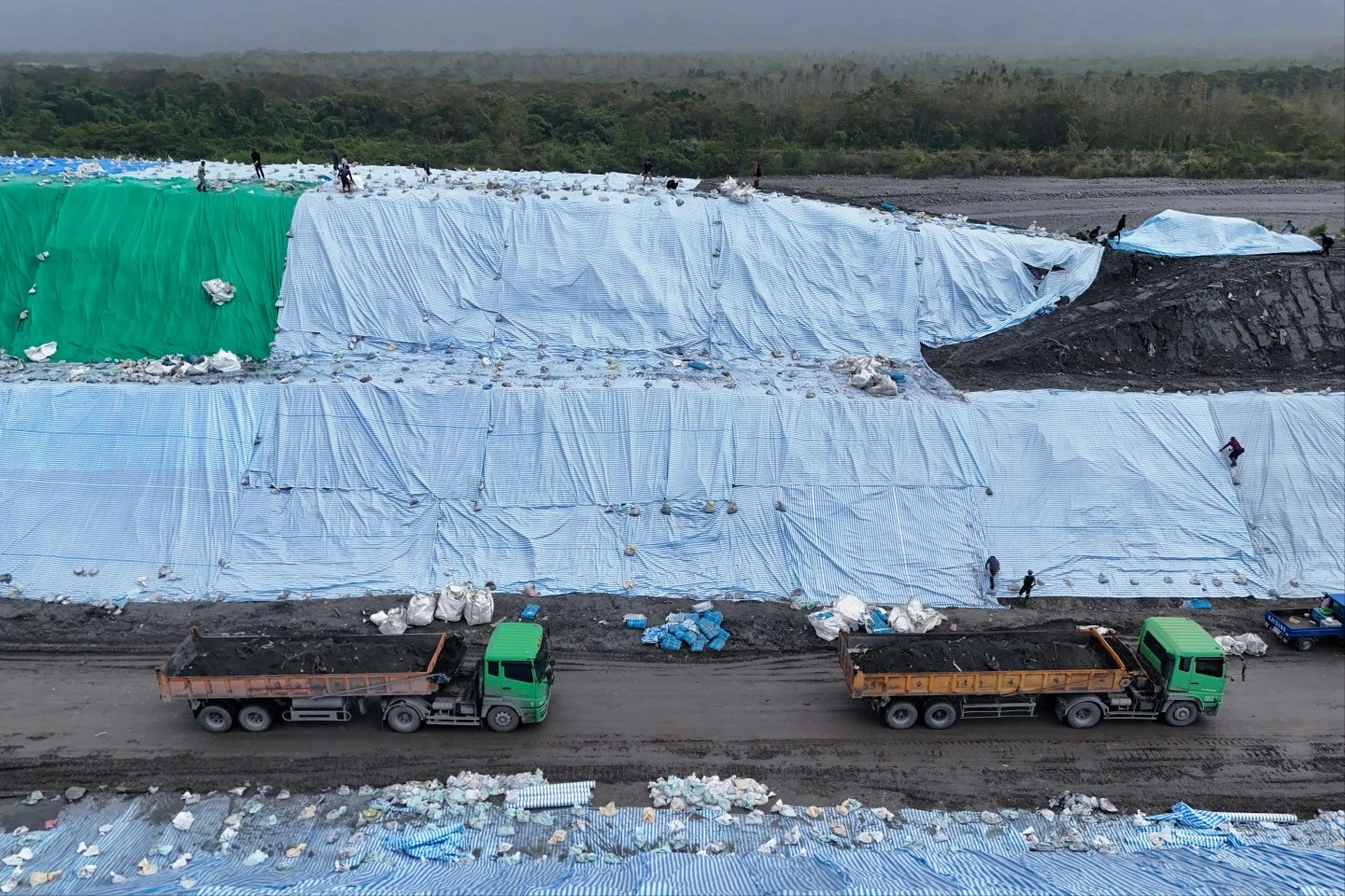 現場已有三分之二覆上帆布,避免近日降雨造成泥沙沖刷,或乾燥後塵土飛揚,靜靜等待後續規劃——未來可望製作為輕質骨材、預拌土壤材料、高強度土壤、肥料或建築填料等。《知新聞》透過高空與地面視角,一圖看懂震撼大土堆現況!