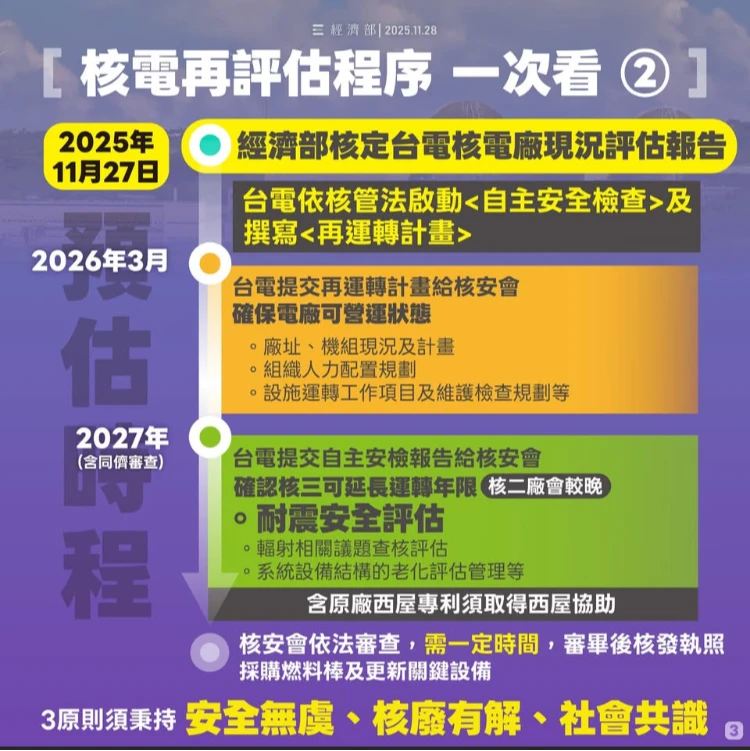 經濟部強調,核電廠重啟程序須依法遵循「兩個必須」,並符合核能政策「三個原則」,將要求台電以最嚴謹態度推動相關作業,確保核能安全符合國際標準。後續除須經國外專業機構技術同儕審查與核安會審查外,仍須進一步取得社會共識。