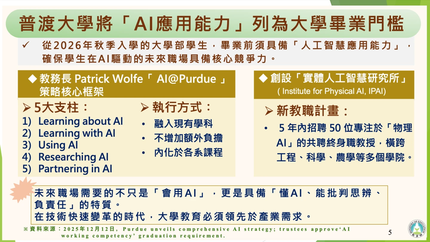 另外,鄭英耀提到,普渡大學一篇報告當中提到,該校主要校區當中,今年9月入學的學生,畢業前都要具備AI應用能力,確保未來在職場上具備核心競爭力,然而,該校並不是額外開AI課,而是融入學科當中,普渡大學也預計在5年內,要聘50位橫跨不同領域,也具備AI運用能力的老師。