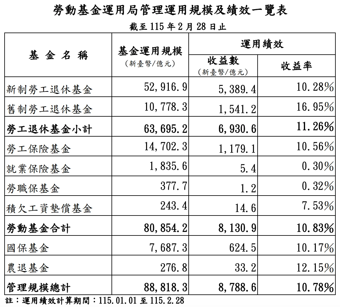 勞金局今天公布2月份勞動基金運用績效,今年截至2月底,整體勞動基金規模8兆854億元,收益數8131億元,收益率10.83%,2月單月收益為4184億元,創下史上單月新高,比起目前單月收益第二高、去年10月3006億元,大幅超越破千億元。