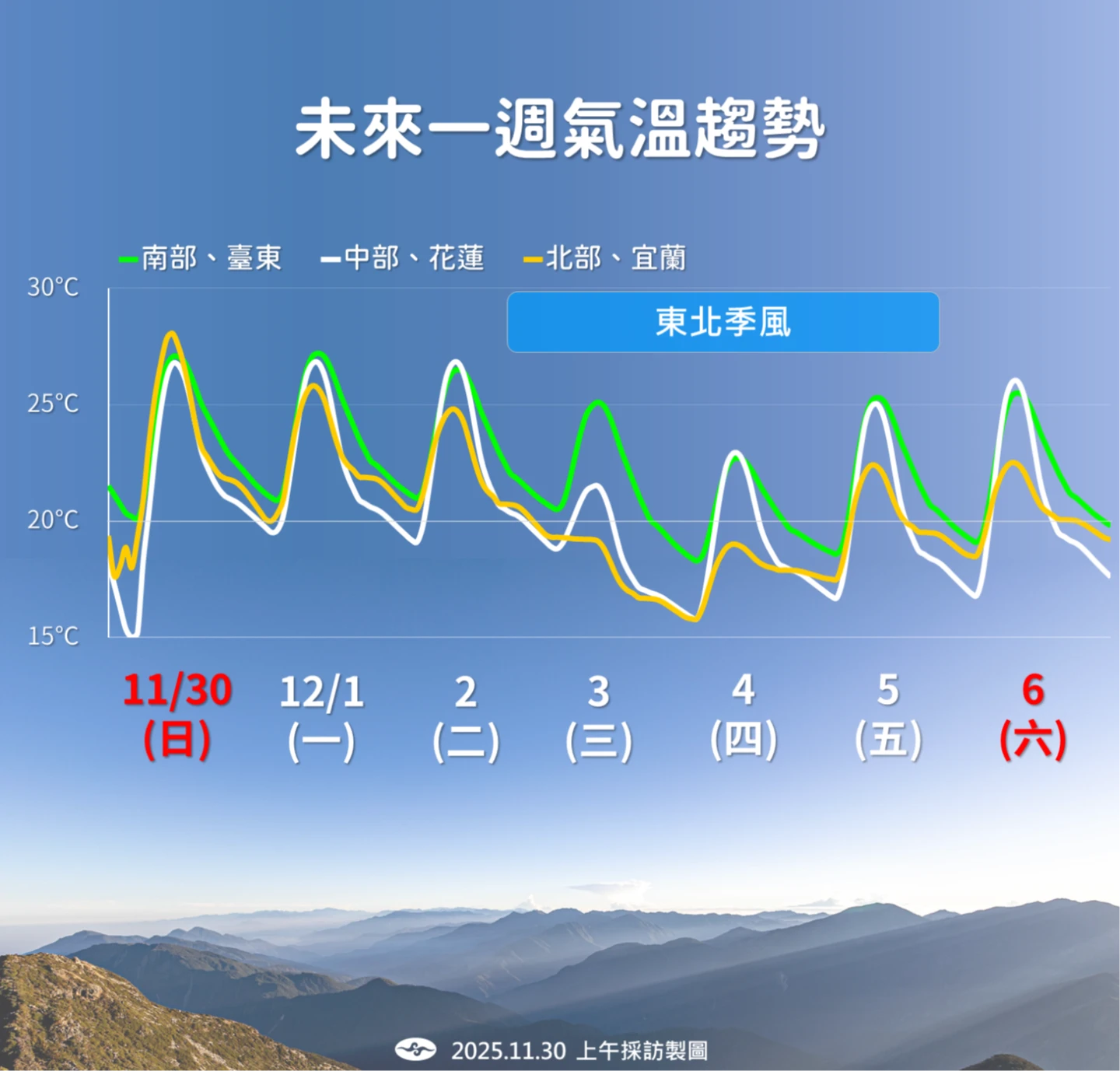 今白天高溫上看28度 清晨輻射冷卻 日夜溫差大