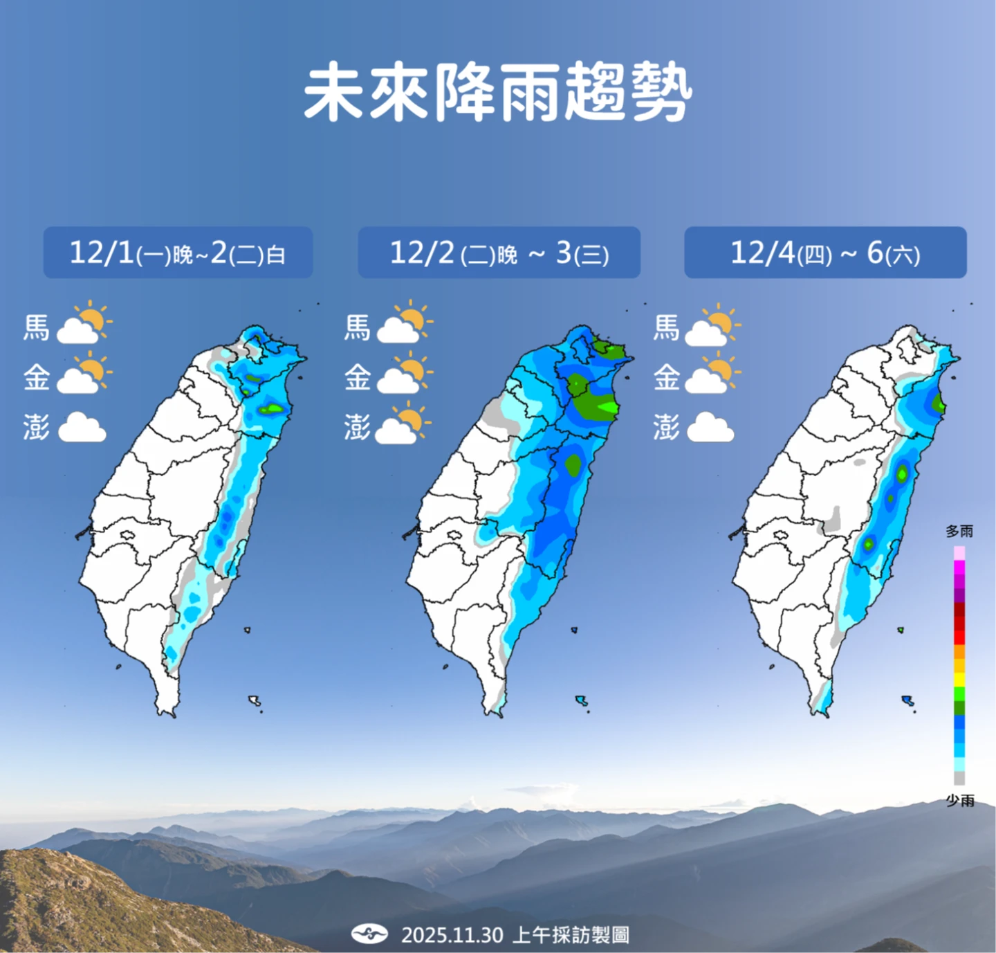 【記者陳力維/綜合報導】中央氣象署表示,今天(30日)台灣環境水氣略有增加,導致各地雲量增多,迎風面的基隆北海岸、東半部地區及恆春半島有局部短暫雨,其他地區也將有零星短暫雨發生的機率。氣象署建議民眾外出時應攜帶雨具備用。另外,氣象專家林得恩指出,下一波冷空氣將在12/3報導,屆時台灣本島中部以北低溫下探14度,離島低至11度左右,先濕冷、後轉乾冷,民眾要做好保暖工作。