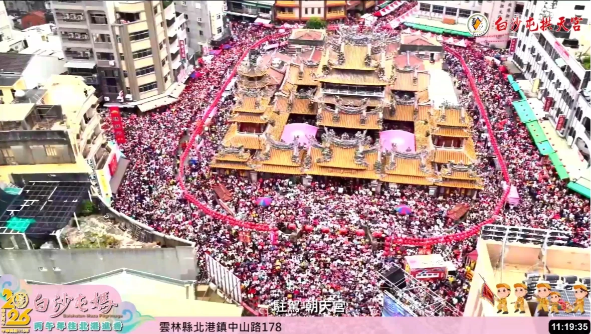白沙屯拱天宮表示,進香隊伍將今天中午吉時抵達北港朝天宮,今早進香隊伍會先在北辰派出所集結進城,因進香隊伍經長途跋涉抵達北港近郊時,媽祖依往例會停駕距朝天宮外3公里的新街「北辰派出所」,為白沙屯徒步香燈腳與搭車進香客會合的地方,來自全國各地數以萬計的信徒都會前來迎接媽祖,現場萬頭攢動。