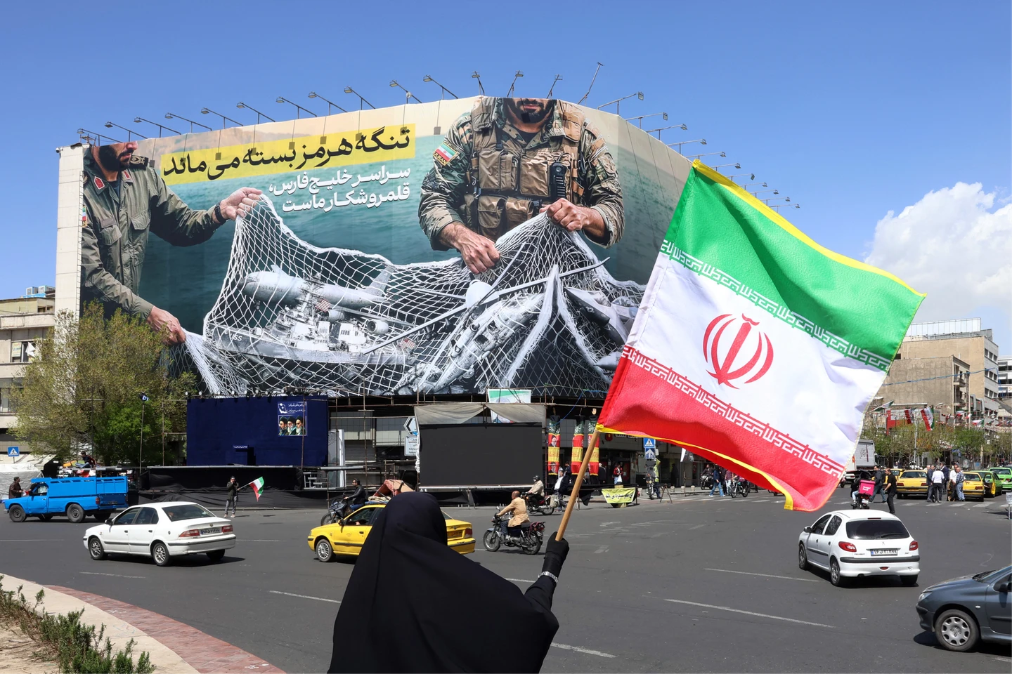 1名女子4月5日手持伊朗國旗,在首都德黑蘭市中心恩格拉布廣場,站在一塊寫著「荷姆海峽仍關閉」的巨型廣告看板旁。圖中繪有伊朗革命衛隊以魚網,網住美軍飛機和船艦。法新社