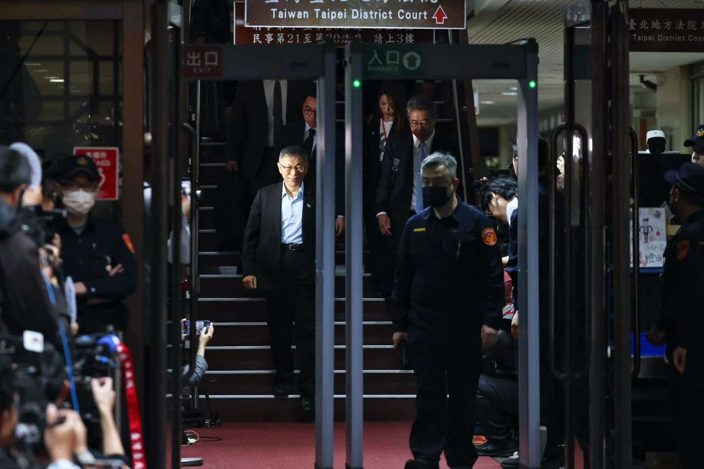 柯文哲下午穿西裝搭乘座車抵達法院,下車時看到法院外大批記者和支持者,隨即露出微笑,支持者高喊「司法要正義」、「阿北加油」。
