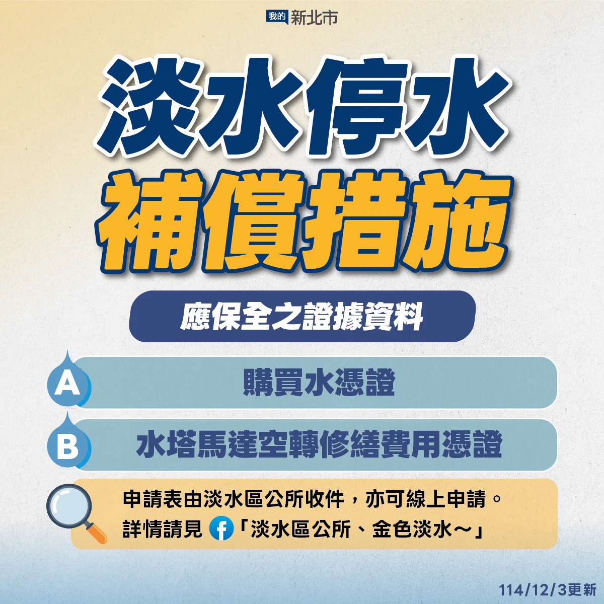另外,針對這次淡水淡北道路工程施工作業疏失賠償問題,侯友宜說,已協調施工廠商啟動補償機制,請民眾提供購買水或水塔馬達空轉修繕費用憑證,透過線上表單或直接前往淡水區公所專責窗口申請,收件時間延長至12月10日。一定要求施工單位榮工這廠商,要跟商家來做協調,要如何做好賠償,一對一地去做一些賠償,如果商家不滿意的話,市府也可以代位求償。