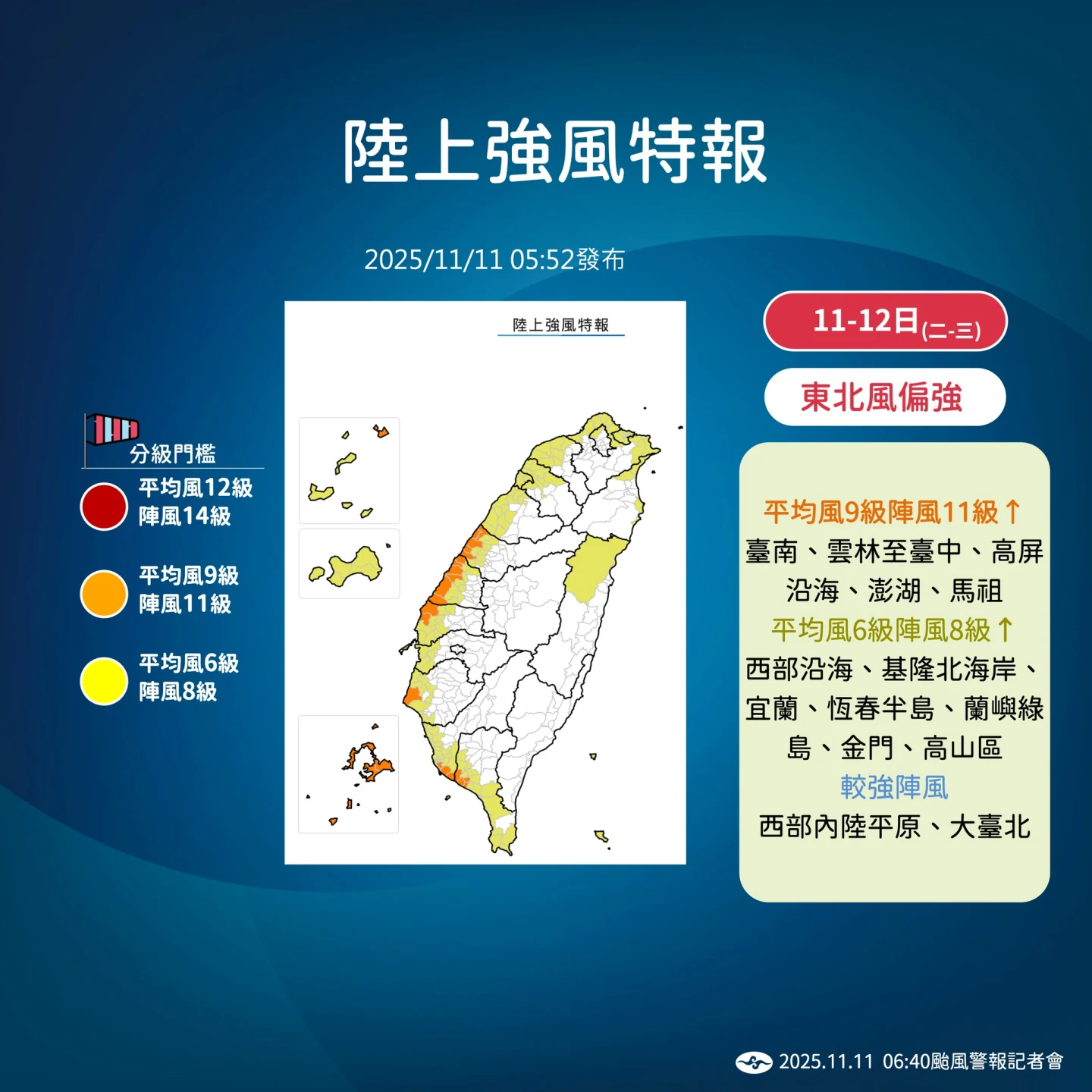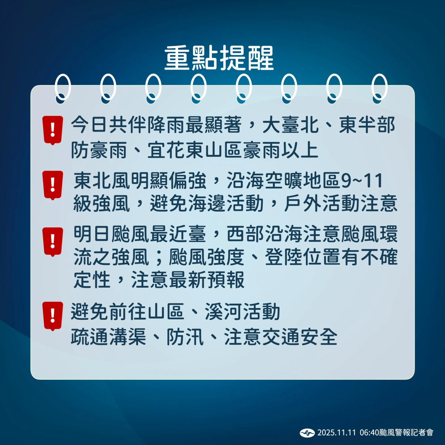 目前各地沿海受東北季風與颱風外圍環流影響,已出現9至12級強陣風,金門、澎湖及恆春半島風勢尤為明顯。沿岸浪高達3至5公尺,東沙島附近甚至出現超過6公尺巨浪,預估今夜至明日西南沿海浪勢將再增強,恐有暴潮發生,籲沿海地區與離島居民務必嚴加防範,避免前往海邊活動。
