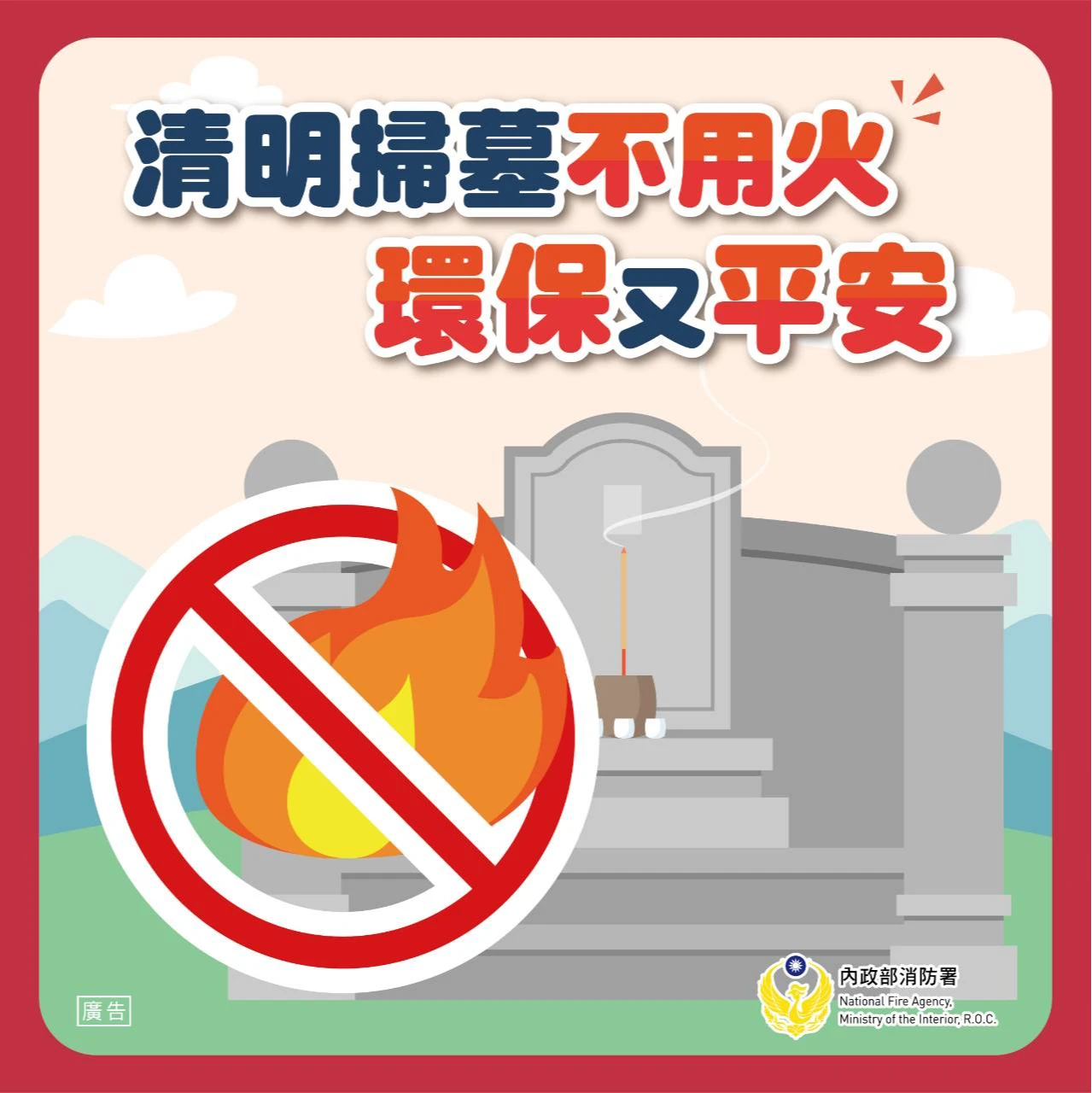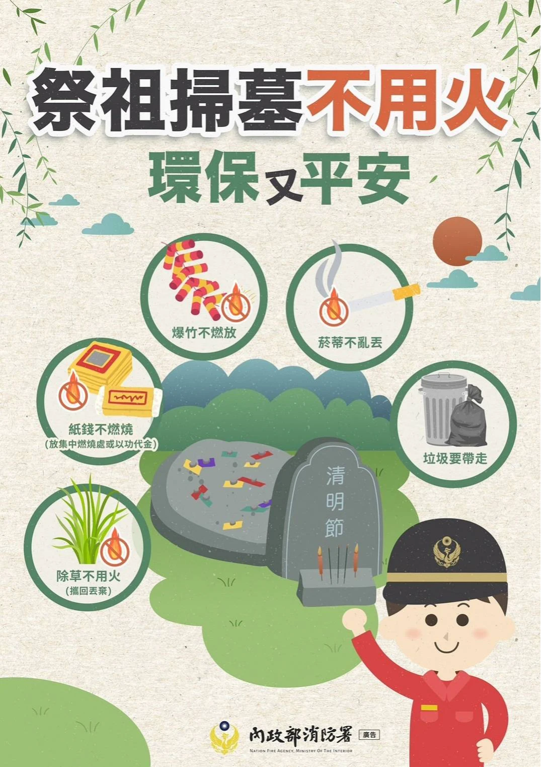 消防署以清明掃墓不用火為主軸,提出「4不1要」原則,包括除草「不」用火、紙錢「不」燃燒、爆竹「不」燃放、菸蒂「不」亂丟、垃圾「要」帶走。地方消防機關也會派駐消防車,前往發生火災頻率較高的墓區及時段駐守,同步利用無人機於墓區警戒,減少墓地雜草火災的發生。