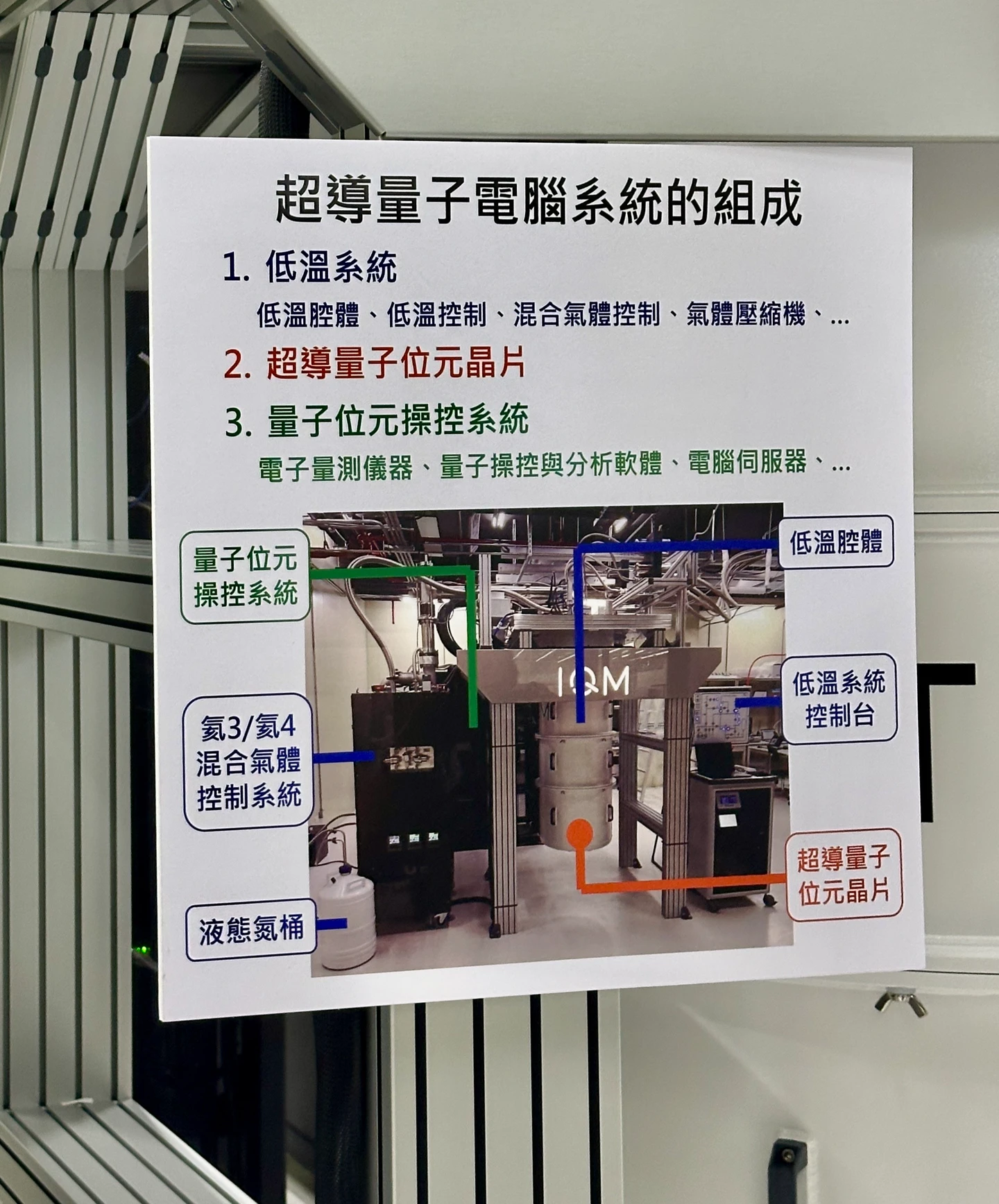 台灣半導體研究中心副研究員林永翰說,這部量子電腦系統可分成三個部分,首先是「低溫系統」,包含圓筒狀的低溫腔體、低溫系統控制台等,第二是「超導量子位元晶片」,放置於低溫腔體當中,第三是「量子位元操控系統」,包含了電子量測儀器、量子操控與分析軟體及電腦伺服器等。