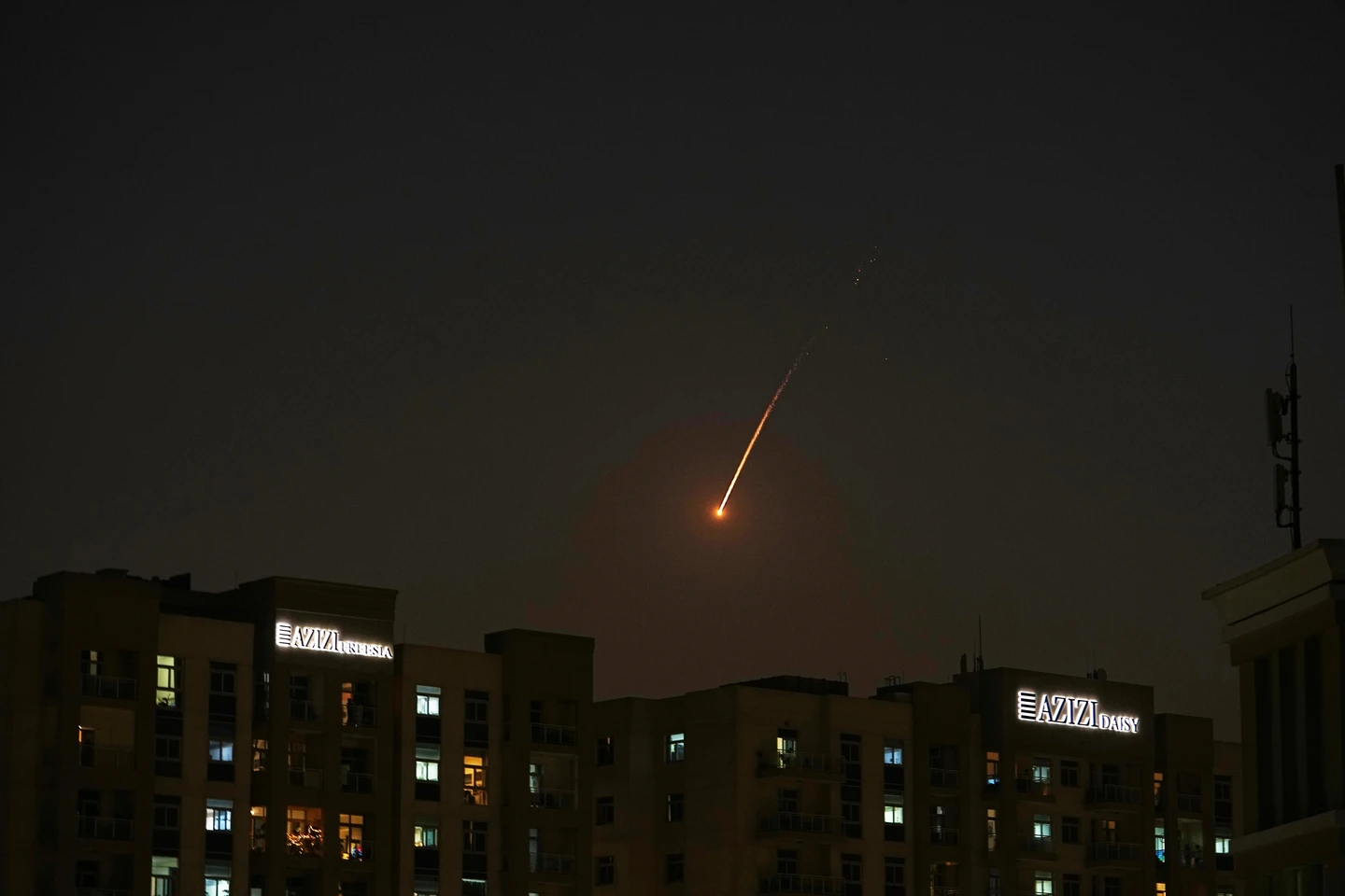 2026年2月28日星期六,一枚砲彈的閃光劃破阿拉伯聯合大公國杜拜的天際線。美聯社 zoomin