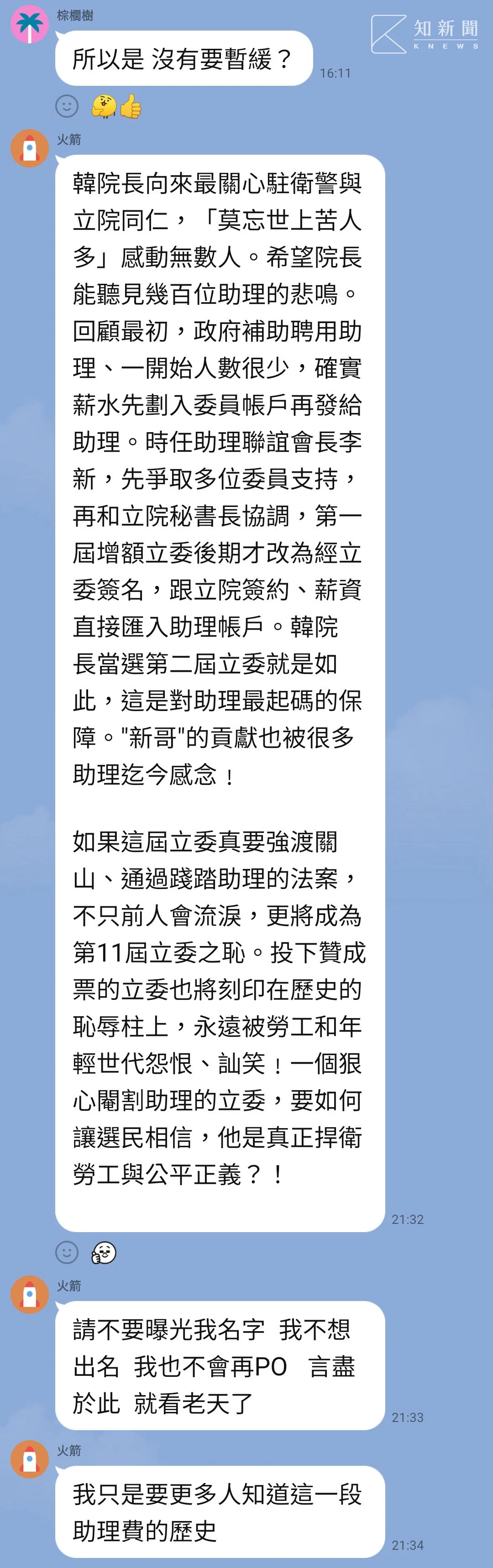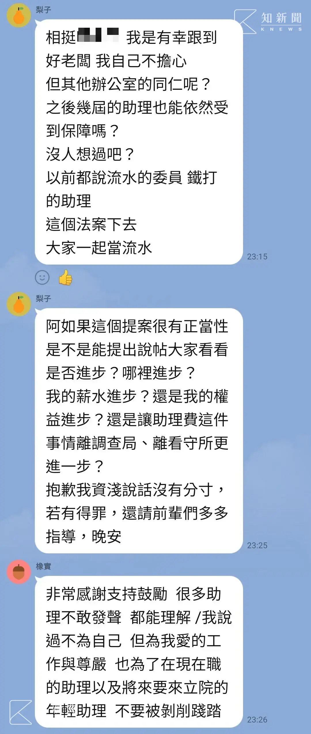 青壯派藍委主任深夜也聲援,「相挺!我是有幸跟到好老闆,我自己不擔心,但其他辦公室的同仁呢?之後幾屆的助理也能依然受到保障嗎?沒人想過吧?以前都說流水的委員,鐵打的助理,這個法案下去,大家一起當流水」。