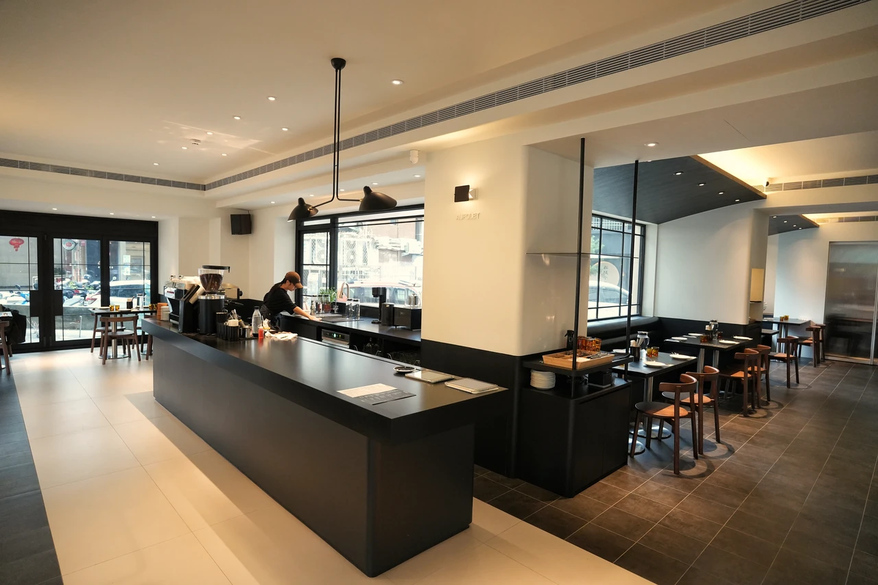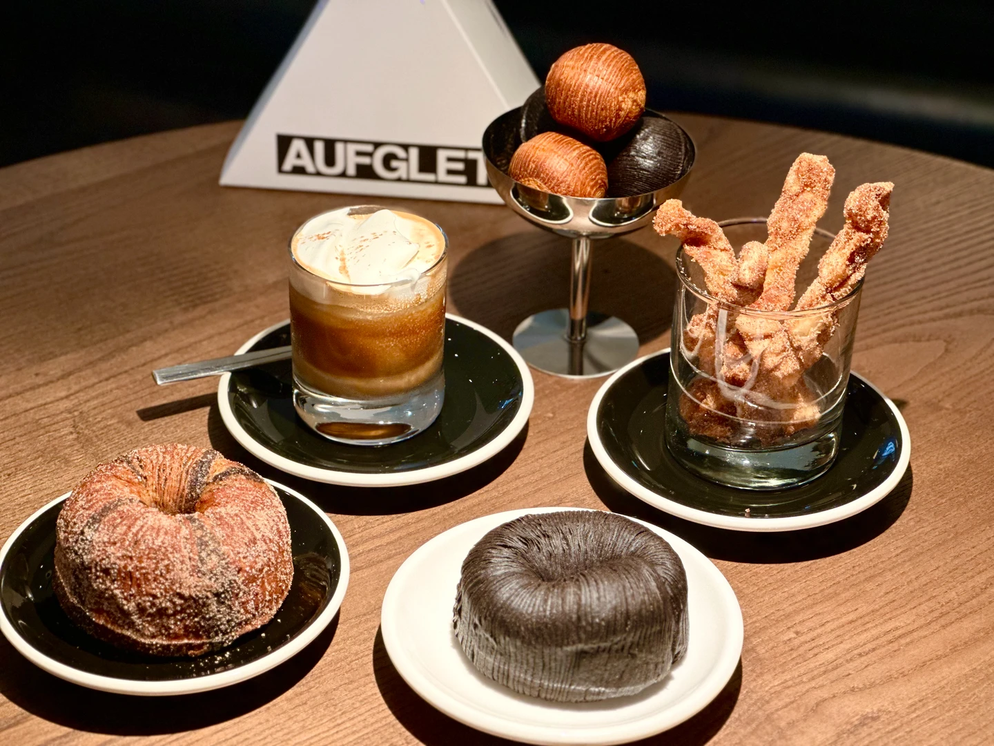 「AUFGLET」在韓國首爾擁有5間分店,以黑色宇宙美學與創意甜點吸引韓星造訪,全台首店插旗台北市大安區安和路一段,同樣承襲黑色為主要視覺設計,將黑色帶進空間設計、燈飾桌面、員工制服。