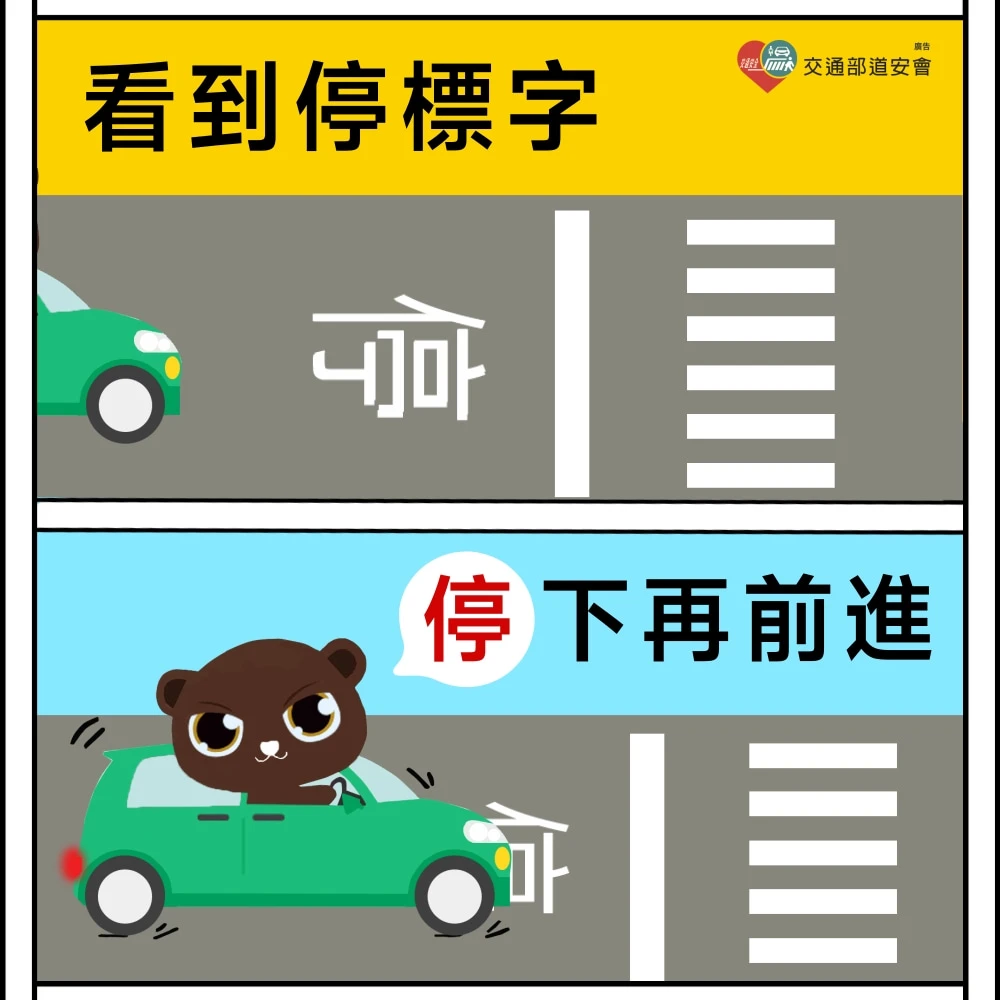 標字「停」與「慢」常見於無號誌路口,駕駛人若看到「停」標誌或標字,表示你在支道上,須停車察看,要讓幹道車先行,等幹道無來車再起步通行。