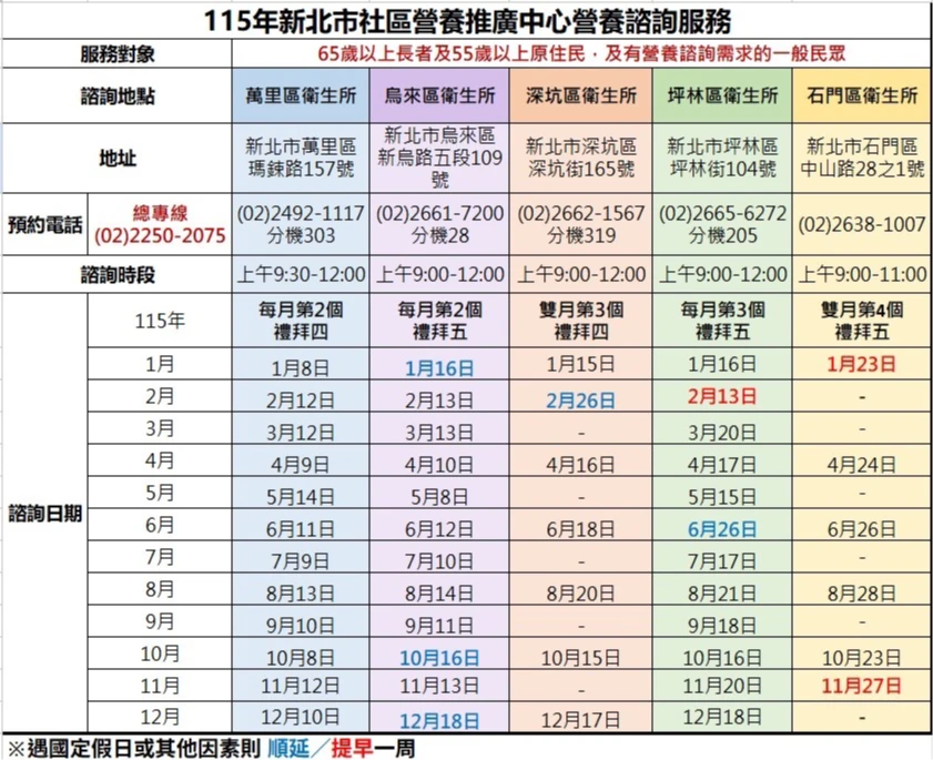 衛生局表示,21處社區營養推廣中心目前有25位營養師輪流駐點服務,提供新北市65歲以上長者及55歲以上原住民市民,免費的營養衛教、營養評估及餐飲營養輔導諮詢服務,民眾可透過線上預約。