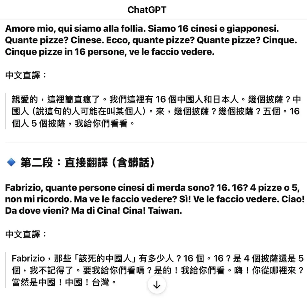 這家位於義大利中部蒙特卡丁尼市(Montecatini Terme)的披薩店老闆帕齊尼(Patrizio Pazzini),日前在該店經營IG上傳影片,以訕笑方式處罵嘲諷一群16人的遊客僅點了5份披薩。他自拍影片請網友猜測遊客是哪裡人,隨後以粗口譏諷這種行為「當然是中國人」。然而,被拍攝的遊客當時並不知情老闆正在嘲諷自己,還對著鏡頭微笑並自稱來自台灣。店老闆笑著開罵要這群人快滾!