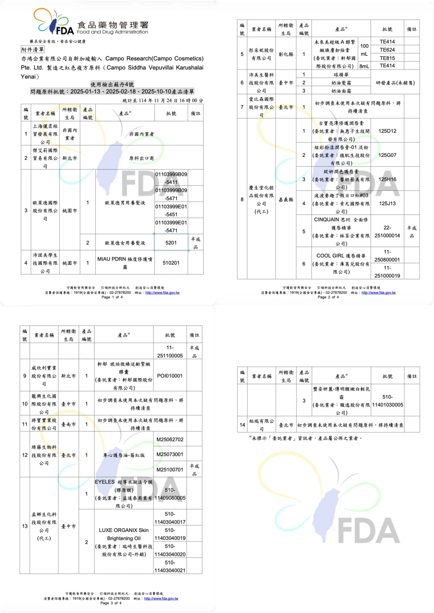 食藥署24日公布原料進口商「亦鴻企業有限公司」下游使用該問題原料的14家國內業者,扣除1國外業者及1原料出口商共12家及其18項產品清單,包括歐萊德男用養髮液、女用養髮液(半成品);未來美超級A醇緊緻煥膚卸妝膏;古寶亮澤修護潤唇膏;波波要趣了假日口紅#03;CINQUAIN思珂全面修護唇精華(半成品);COOL GIRL護唇精華:綠藤生機專心護唇油-莓紅版半成品等。
