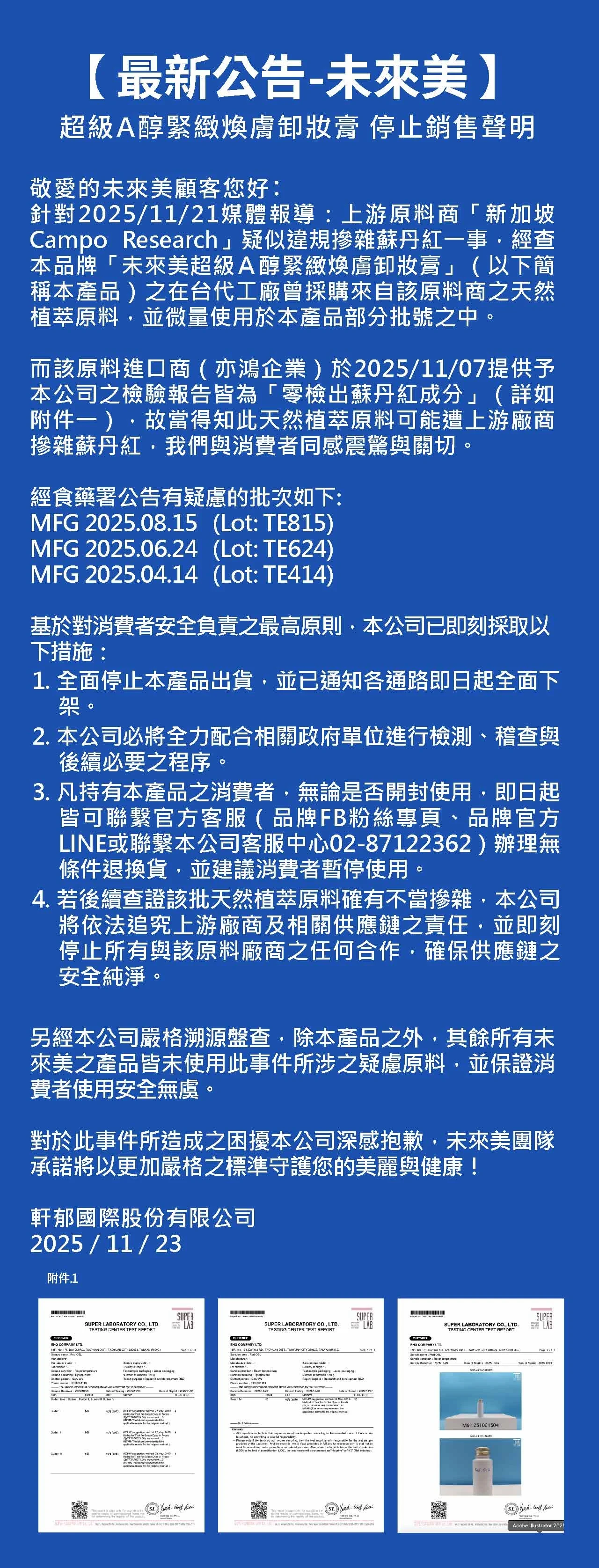 未來美昨天發出公告,指出「未來美超級A醇緊緻煥膚卸妝膏」之在台代工廠曾採購來自該原料商之天然植萃原料,並微量使用於本產品部分批號之中,這件事和消費者同感震驚,宣布停止銷售該產品。