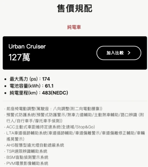 在動力與續航表現上,台灣導入的Urban Cruiser確認搭載61kWh的磷酸鐵鋰(LFP)電池,採前驅單馬達配置,根據WLTP測試標準,其純電續航里程可達426公里,能輕鬆對應都市通勤與中長途旅遊,全車標配36項主被動安全科技。