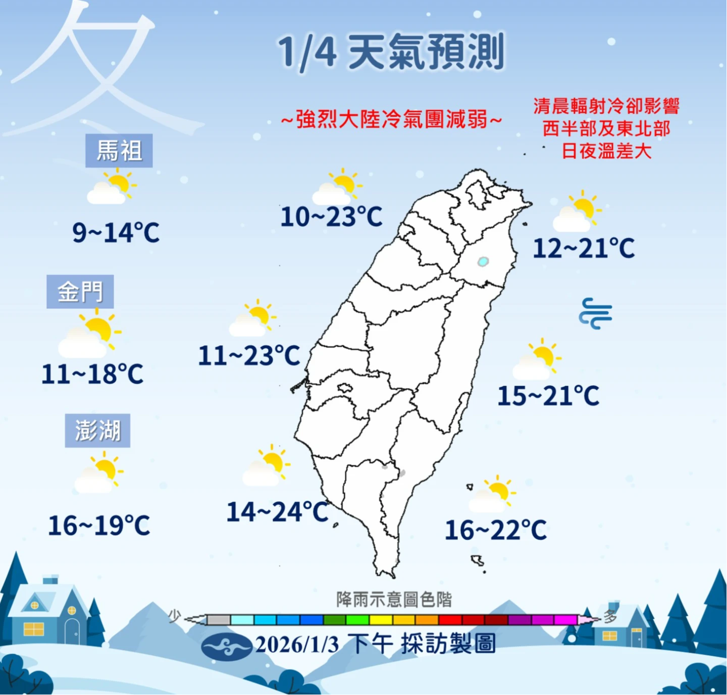 白天起冷氣團減弱,高溫中部以北及東半部約21至23°C,南部可達24°C,西半部與東北部日夜溫差明顯。澎湖16至19°C,金門11至18°C,馬祖9至14°C,多為晴時多雲。東北風偏強,苗栗至台南、台東、恆春半島及澎湖、馬祖、綠島,局部地區有平均風6級或陣風8級以上發生機率。