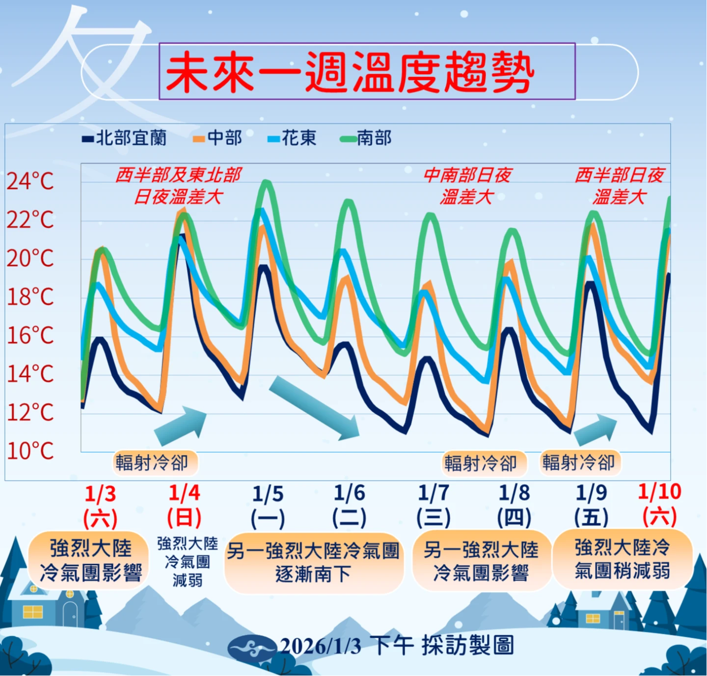 林得恩說,這段期間,前後分別受強烈大陸冷氣團、大陸冷氣團、輻射冷卻及東北季風增強等天氣系統影響;其中1/3至1/4及1/7至1/10,研判將是降溫最為顯著,降幅最為劇烈的2個時段。