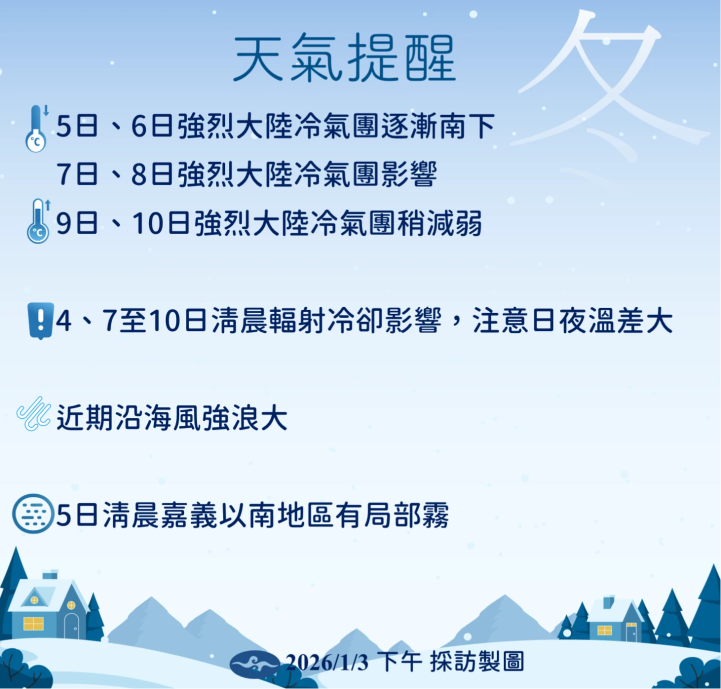 周五(9日)至周六(10日)冷氣團雖稍減弱,白天氣溫回升,但受輻射冷卻影響,早晚依然偏冷,西半部日夜溫差大,中部以北低溫仍維持在9至11°C左右。此外,東北風偏強,苗栗至台南及離島沿海空曠地區易有強陣風。
