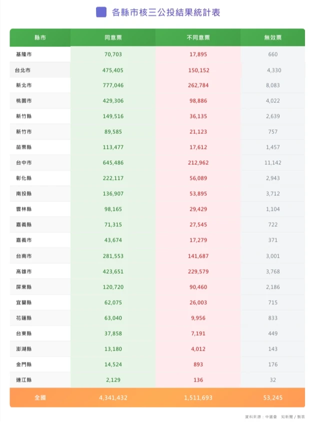 核三公投失敗|一表看各縣市票數 434萬票同意!差65.9萬票沒通過
