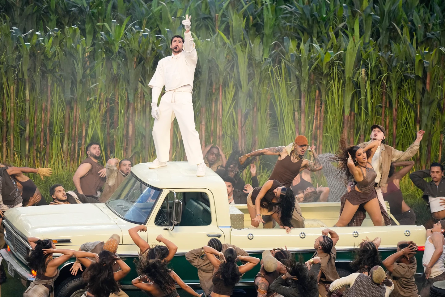 這場精心安排的中場秀,「壞痞兔」呈現波多黎各風情,舞台上可見甘蔗田、傳統刨冰攤及婚禮場景,其中婚禮場景裡,一對新人在全球觀眾的見證下完婚,「壞痞兔」甚至親自擔任證婚人,在結婚證書上簽名,新人還在舞台上切婚禮蛋糕,分享喜悅時刻。