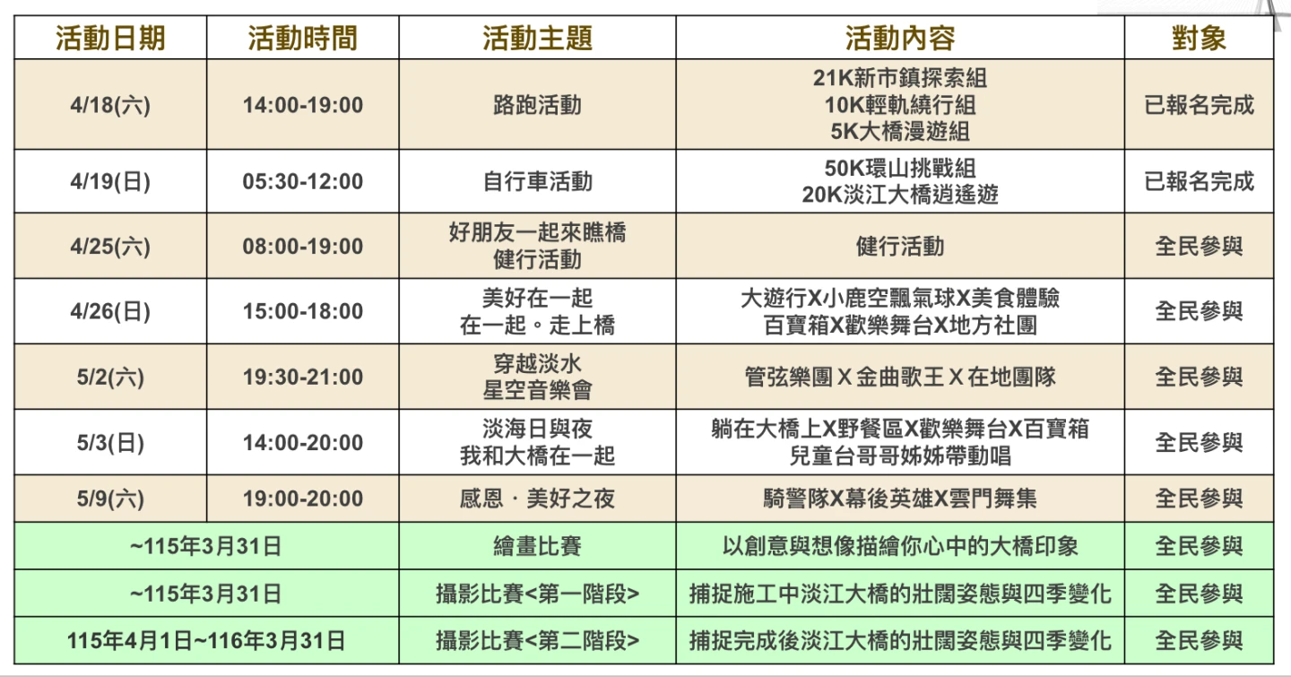 公路局新公北分局分局長陳永傑說明,淡江大橋一系列活動,包含4月18日路跑活動、4月19日自行車活動,上述已報名完成;4月25日健行活動、4月26日走上橋(大遊行X小鹿空飄氣球X美食體驗、百寶箱X歡樂舞台X地方社團)、5月2日星空音樂會(管弦樂團X金曲歌王X在地團隊)、5月3日我和大橋在一起(躺在大橋上X野餐區X歡樂舞台X百寶箱、兒童台哥哥姊姊帶動唱)、5月9日感恩.美好之夜(騎警隊X幕後英雄X雲門舞集),即起至3月31日,繪畫比賽(以創意與想像描繪你心中的大橋印象)、攝影比賽第一階段(捕捉施工中淡江大橋的壯闊姿態與四季變化)及第二階段4月1日至2027年3月31日,上述皆為全民參與。