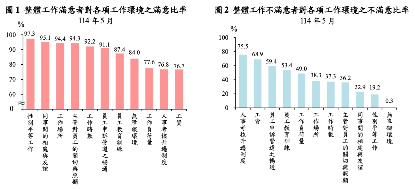 勞動部今天公布去年勞工生活及就業狀況調查統計結果,在工作滿意度方面,調查顯示,勞工對整體工作感到滿意的比例73.7%,感到普通者23.2%,感到不滿意者3.1%。其中,較為滿意的項目包含性別平等工作、同事間的相處與友誼、工作場所等,而工資、人事考核升遷制度,則位處滿意項目最後兩名,以及最不滿意的項目前兩名。