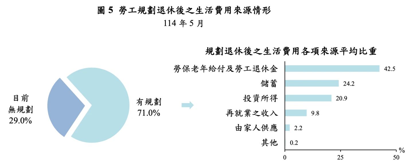 調查也顯示,勞工退休後的生活費用來源,目前尚無規劃者約29%,有規劃者約71%,有規劃退休後經濟來源的勞工當中,各項財源平均占比以勞保老年給付及勞工退休金42.5%最高,儲蓄占24.2%,而投資所得占20.9%,另外,再就業之收入占9.8%。