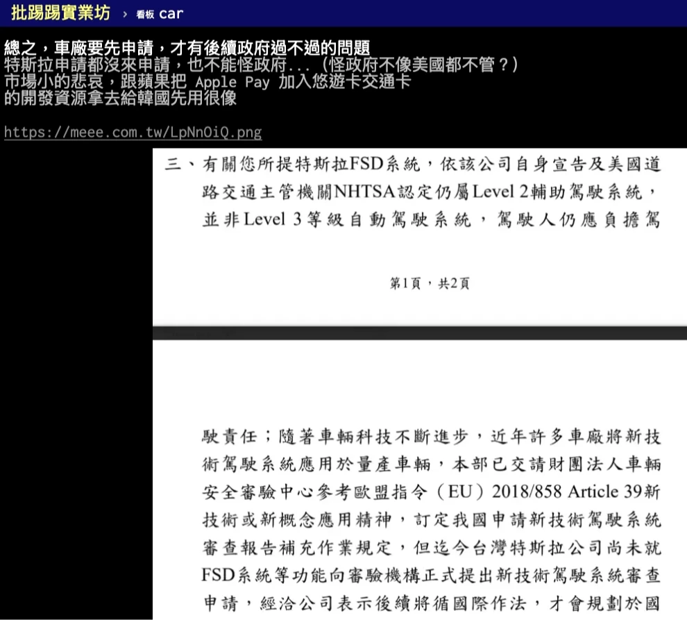 看到歐洲傳來好消息,台灣車主也相當關心國內的開放進度。有論壇PTT網友去信向交通部詢問台灣為何遲未讓FSD上路?結果上周收到交通部回覆指出,台灣車安審驗規範主要接軌歐盟,而針對這種現有法規無法涵蓋的新技術,已在2025年2月核定了「113-04/MR14-04申請新技術駕駛系統審查報告補充作業規定」。